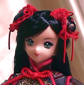 チャイナさん1号、2号ときたので、次はV3かなと思いきや、ブラックまで飛んでしまいました。そのうちチャイナさんアマゾンとか、チャイナさんストロンガーとかでてきたりして(冗談ですよ〜) この子は、お誕生日を忘れてしまいました。忙しかったのですね。2体造って、1体はお嫁入りしました。 お嫁入りした子は真ん中分け、この子は、横分けです。植毛の都合で、そうなってしまいました。 今はどこかで、幸せにしていると思います。 ドレスは、1号2号が着ているチャイナ風ドレスのバージョン違いです。色が黒×赤ということもあって、なんだか「戦体ものの敵の女ボス」みたいだという説も。でも、カフス付き・オーガンジーの袖はちょっと気に入ってます。髪飾りには、赤いひらひらとリリアンのリボンを飾ってみました。 |