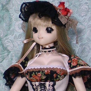 | ヘッドドレス | ワンピースと同じ生地がベース。リボンで結ぶタイプです。 同様に黒・茶・生成りレースで飾り、バラとベージュのレースでリボンをつけました。 |