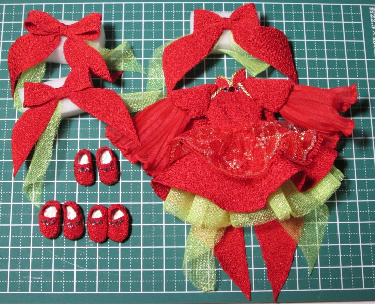 ワンピース、頭飾りのリボン、ひらひらのぱんつ、靴の4点です