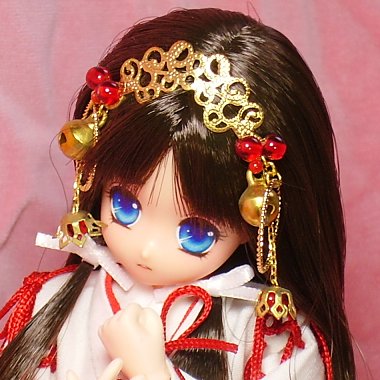 濃いこげ茶のストレートロング 後ろはヘッド購入時の長さのままです 耳の脇の髪を少しまとめて結び、一部を固めてあります 髪飾りは金の鈴と輪、ガラスビーズのほか 金色の鎖でパーツと赤いビーズを下げています