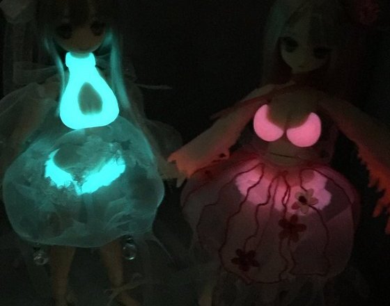 緑がかった明るい青に発光します(画像右は赤くらげちゃん)