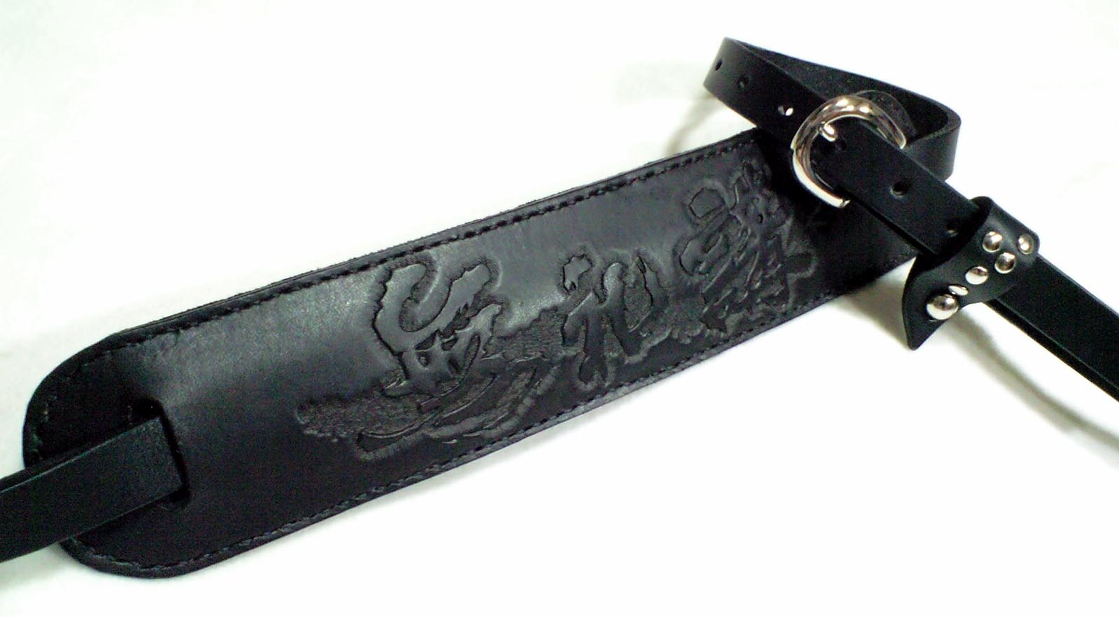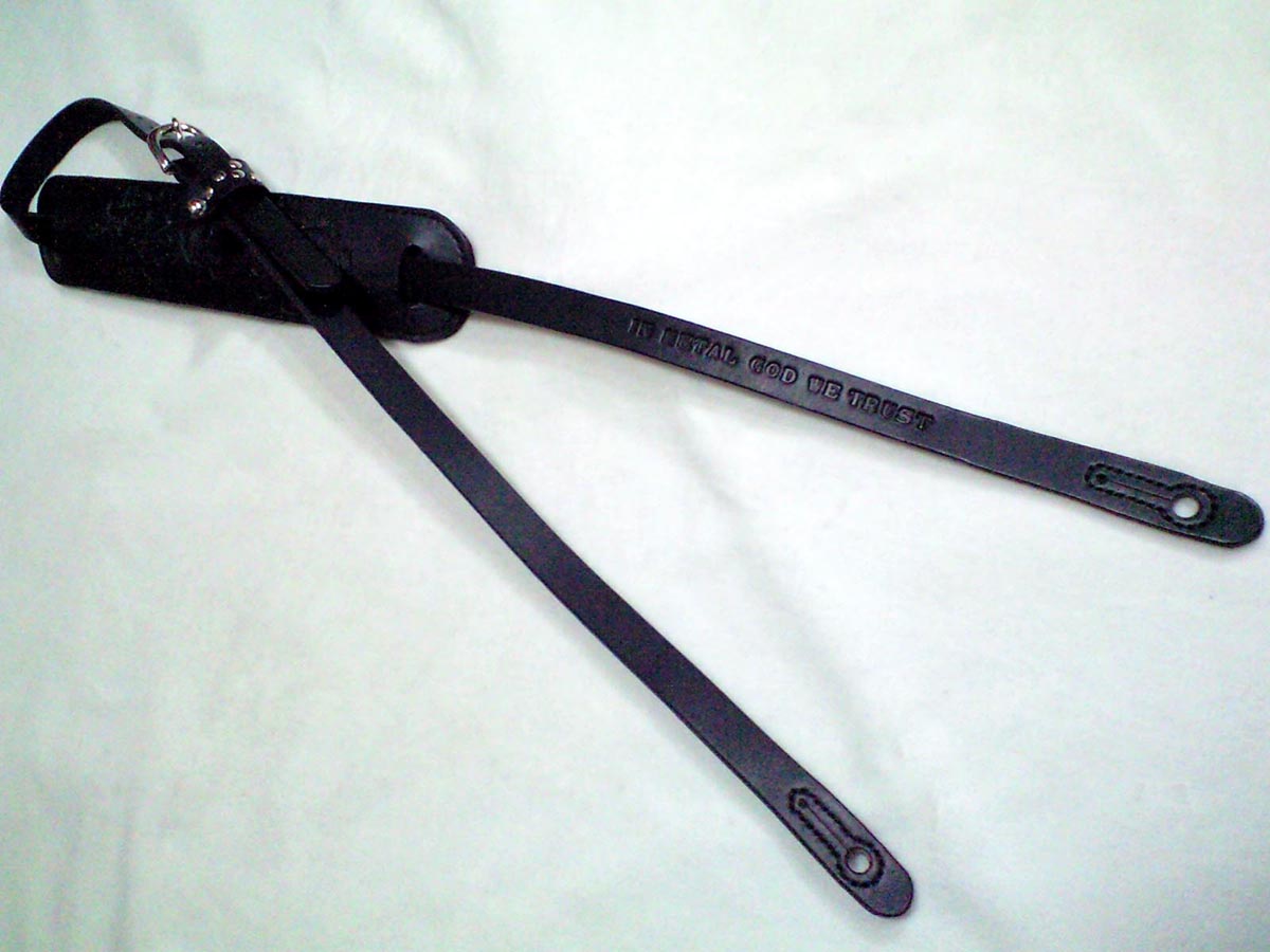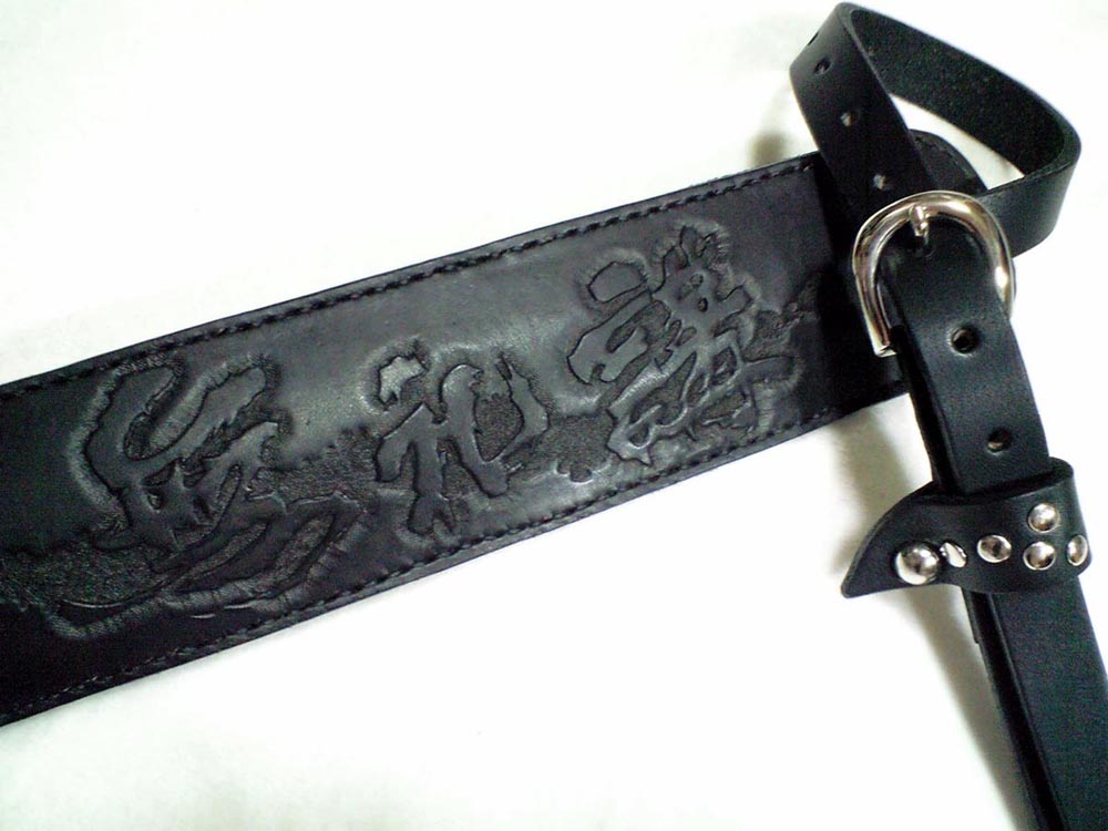 本体は2cm幅の肩パッドタイプ。肩パッドにはバンドロゴをカービング、本体フロント部にもキャッチコピーを刻印で打刻。ワンポイントとなっているサル革(ベルト通し)はお客様からのご指定のデザイン。