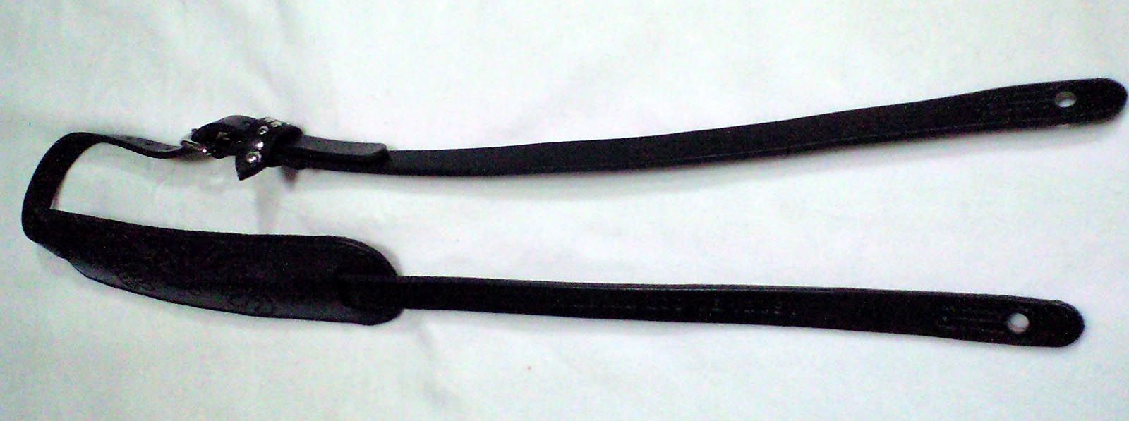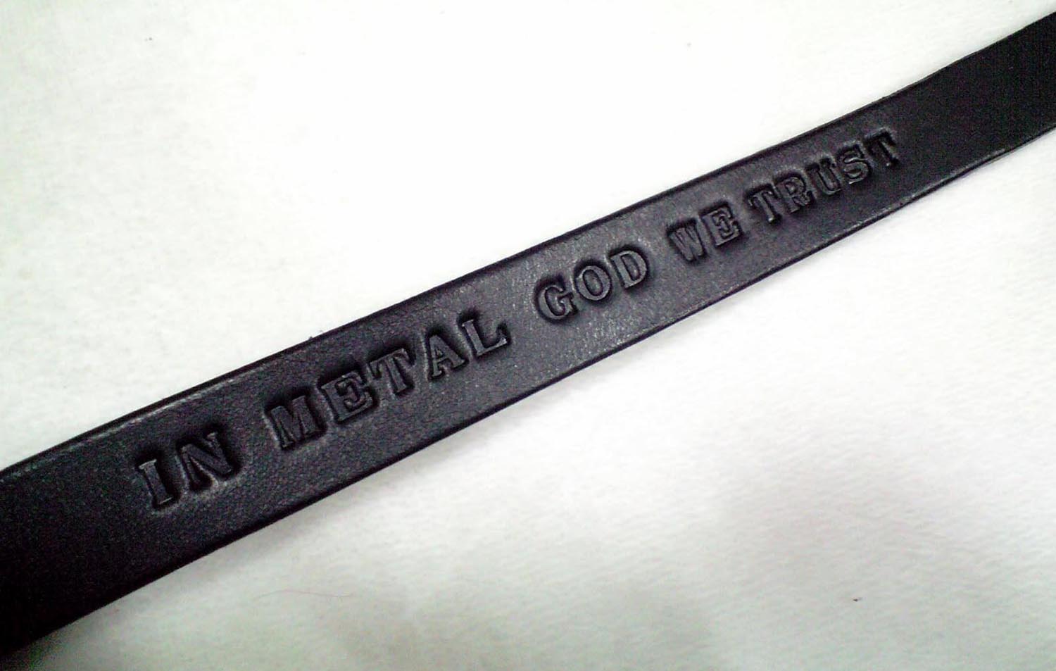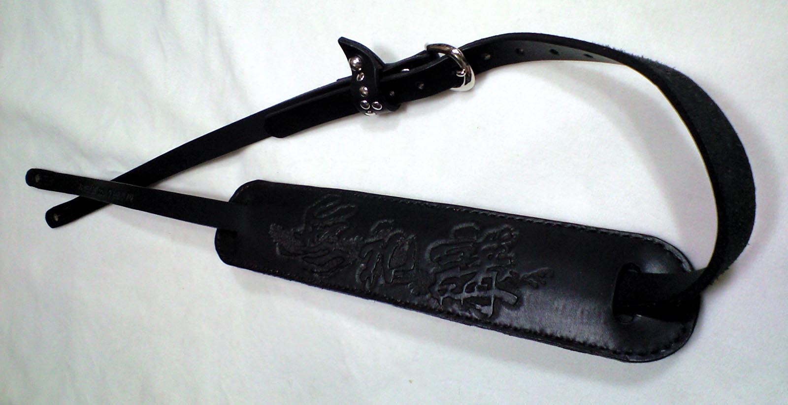 本体は2cm幅の肩パッドタイプ。肩パッドにはバンドロゴをカービング、本体フロント部にもキャッチコピーを刻印で打刻。ワンポイントとなっているサル革(ベルト通し)はお客様からのご指定のデザイン。