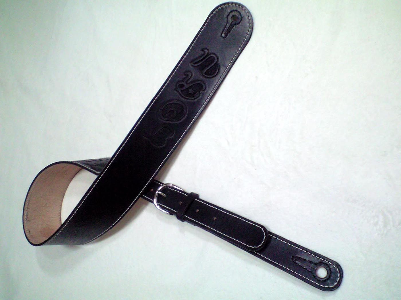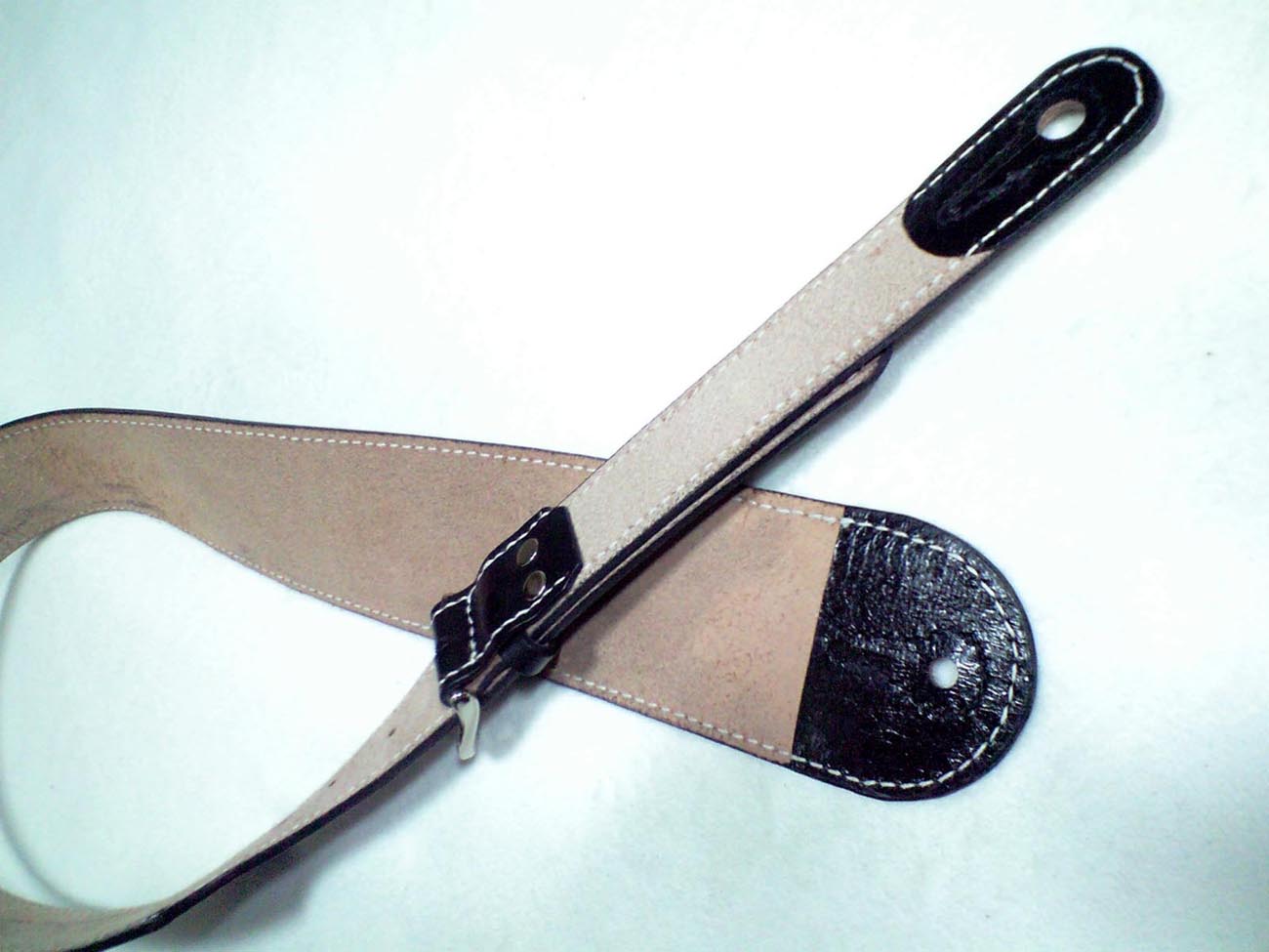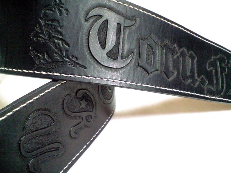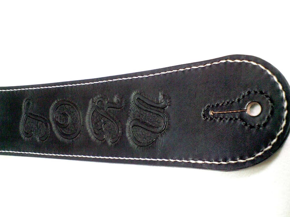 本体7cm幅、バックル調節タイプです。フロントには拘りの筆記体を縦に並べたネームのカービング、背面にも違うフォントでのネームと装飾のカービング、全体の白い飾りステッチがポイントです。ピン穴には裏に当て革をし補強ステッチを。エンドピンはジャックタイプです。