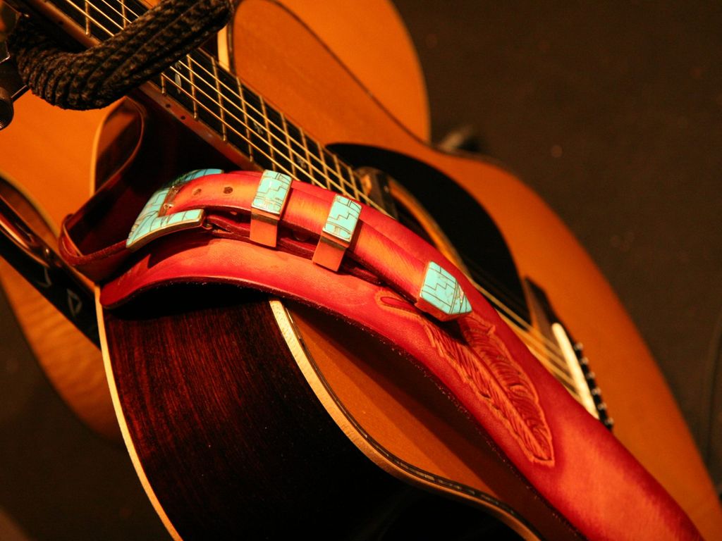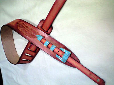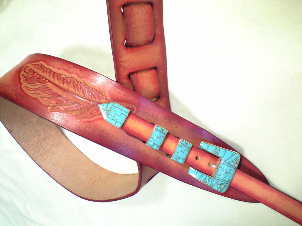 赤のグラデーションにターコイズのバックルセット(お客様の持ち込み)が映えてます。このバックルセットと、フェザーのカービングがフロントのいい位置に来るようにするために、バックルセットはほぼダミーとし、長さ調節は後ろのスリットで行う仕様となっています。