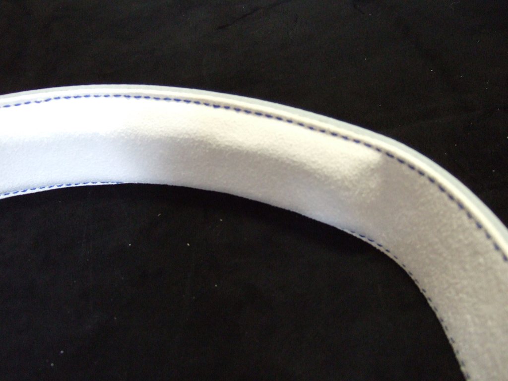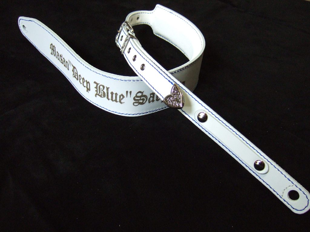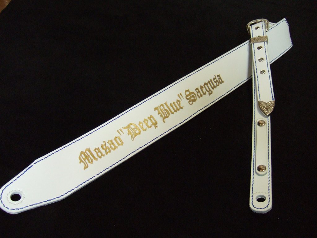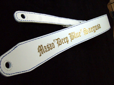 | No.90のフォルムでありながら、ゴールドの文字入れと青いステッチで全く違った雰囲気のものになりました。裏には滑りにくいベロアを貼り、肩部分にウレタンを内蔵しています。文字はカービング無しでリキテックスでのペイントのみですが、厚く塗らないと綺麗なゴールドにならず幾重にも塗り重ねが必要でしたので、かなり時間がかかってます。 ギター装着画像はお客様より送っていただきました。 参考価格 20,300円 |
