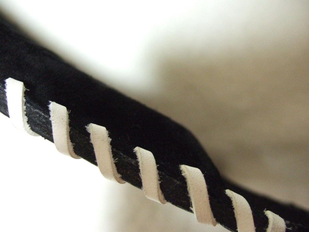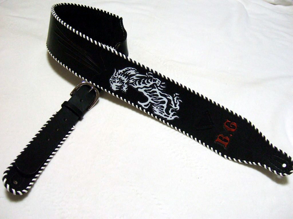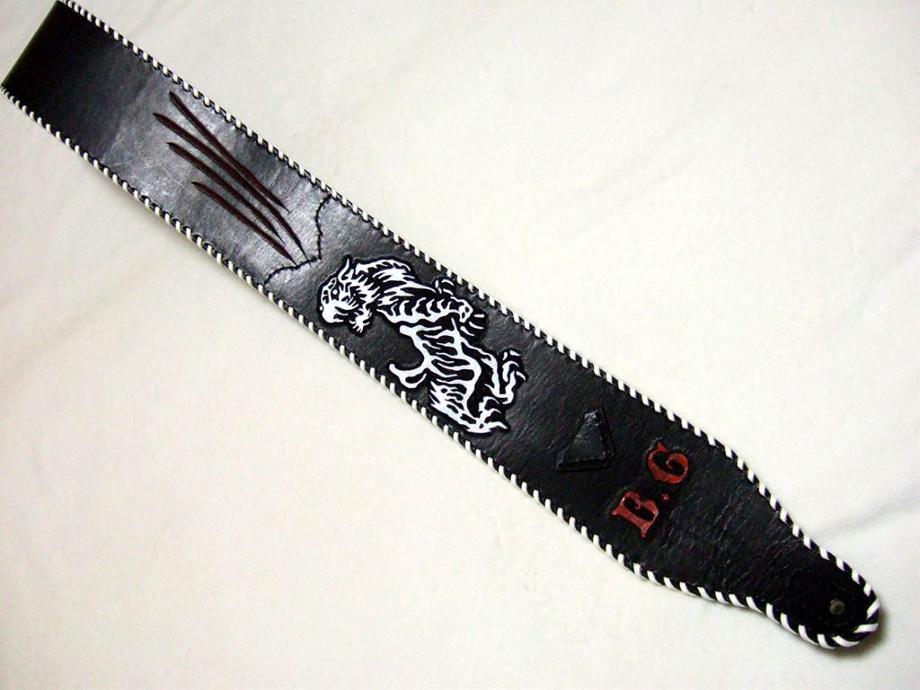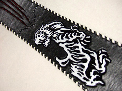 フロント部の虎の全身絵柄をカービングで綺麗に入れるために9cm幅と幅広になりました。虎の上には引っ掻き傷を、ということでスーベルカッターで深めにカットし、えぐれたように開いて中を赤く塗っています。(結構生々しいです。。)フロント部にはピックポケットとイニシャルも入れてます。背面にも虎の顔のトライバル模様。肩部分には厚めのウレタンを内蔵し、ウレタン部分のみ裏革を貼っていて、その裏革を縫い留めるためのステッチが表に出ています。白革レースの縁かがりと共に白、黒、赤とインパクトの強い仕上がりになりました。