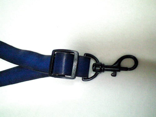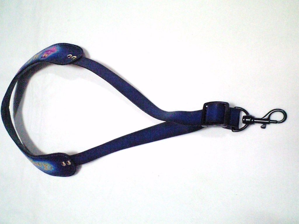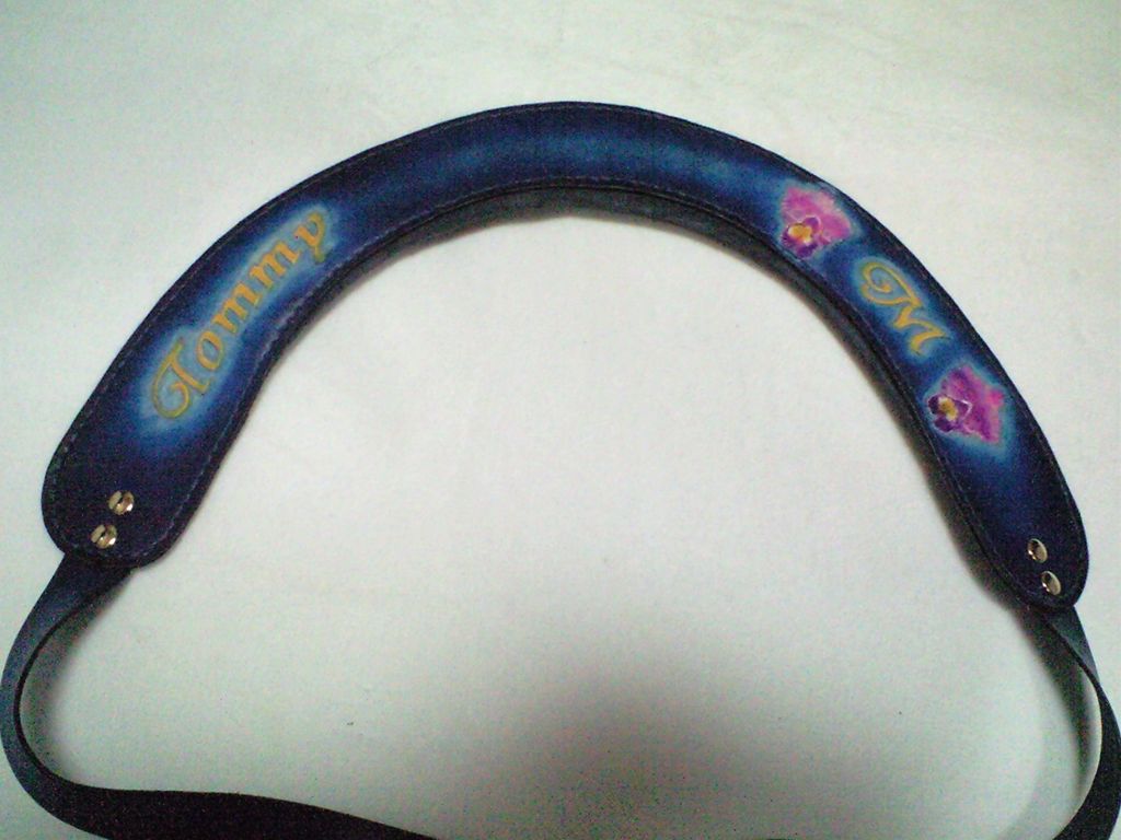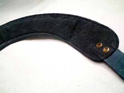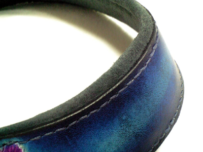 濃い青のグラデーションにカトレアの花とネームをカービングしたものです。首への負担を軽減するために、ストレートなフォルムではなく、このようにブラウスの衿のようなフォルムをお選びでした。それでも1枚革では首が擦れるように思いウレタンをずらして内蔵しスエードで包みました。ウレタンとスエードを表革からずらしてあるので表革のコバが首に当たることはありません。