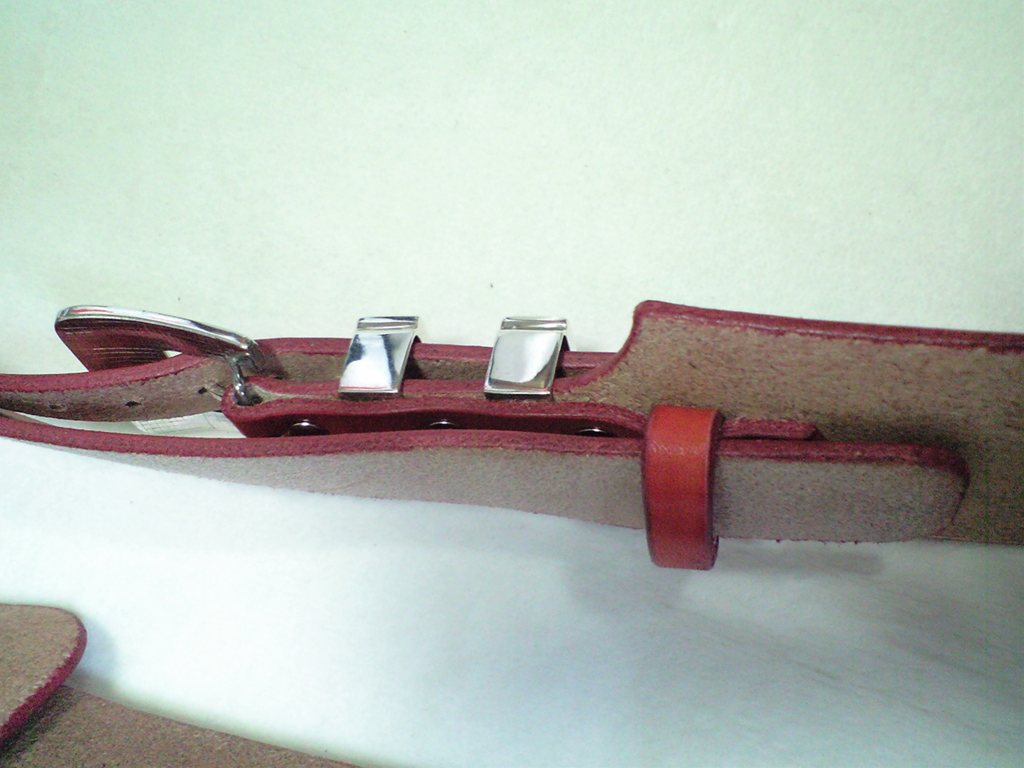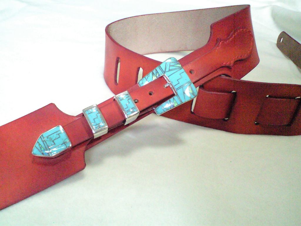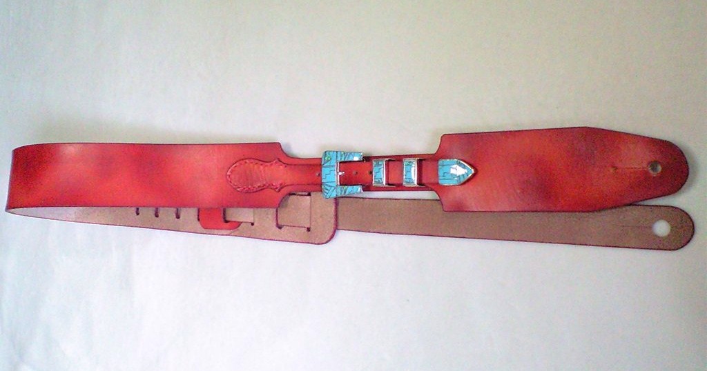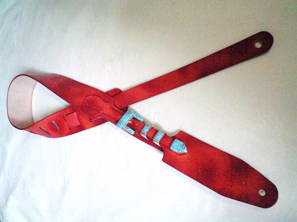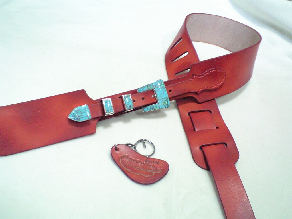 | No106と同じ方からのご注文です。赤とターコイズ、その2です。前作同様本体幅は6cmでバックルセットが1,8cm幅。今回のフォルムですとバックル調節部が細すぎてしまうので、レンジャーベルト風にベルト部分を2枚仕立てにし、下の革を3cm幅にしました。今回もバックル調節部はほぼダミーで、長さ調節は後ろのスリットで。そして本体の色は、POPすぎない赤に、濃い赤をぼかしで斑染めで、というこれまた難しいリクエストでしたが、今回は見事に期待に応えることが出来たようです。エンドピン穴はどちらもエンドピンジャック仕様です。 価格の掲載は控えさせていただきます。 |