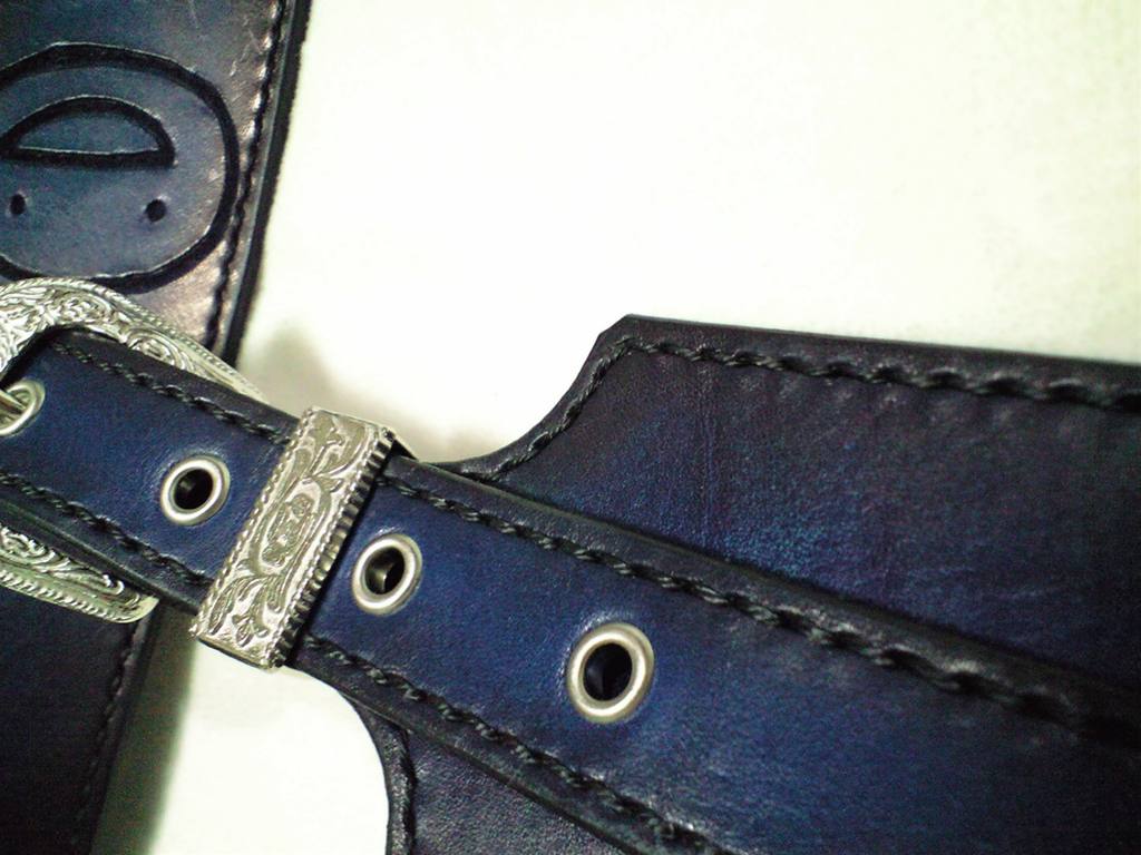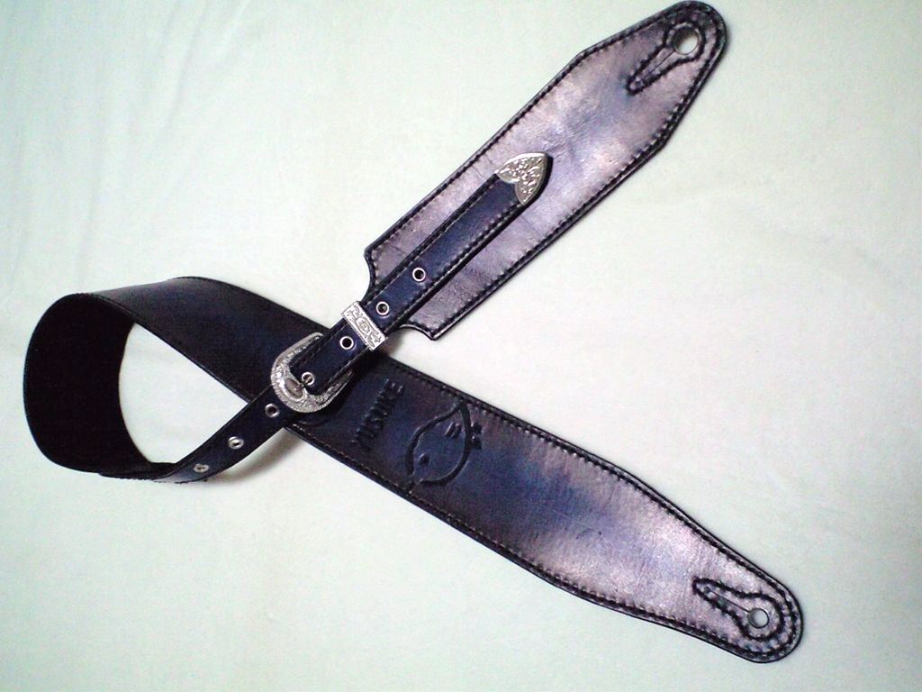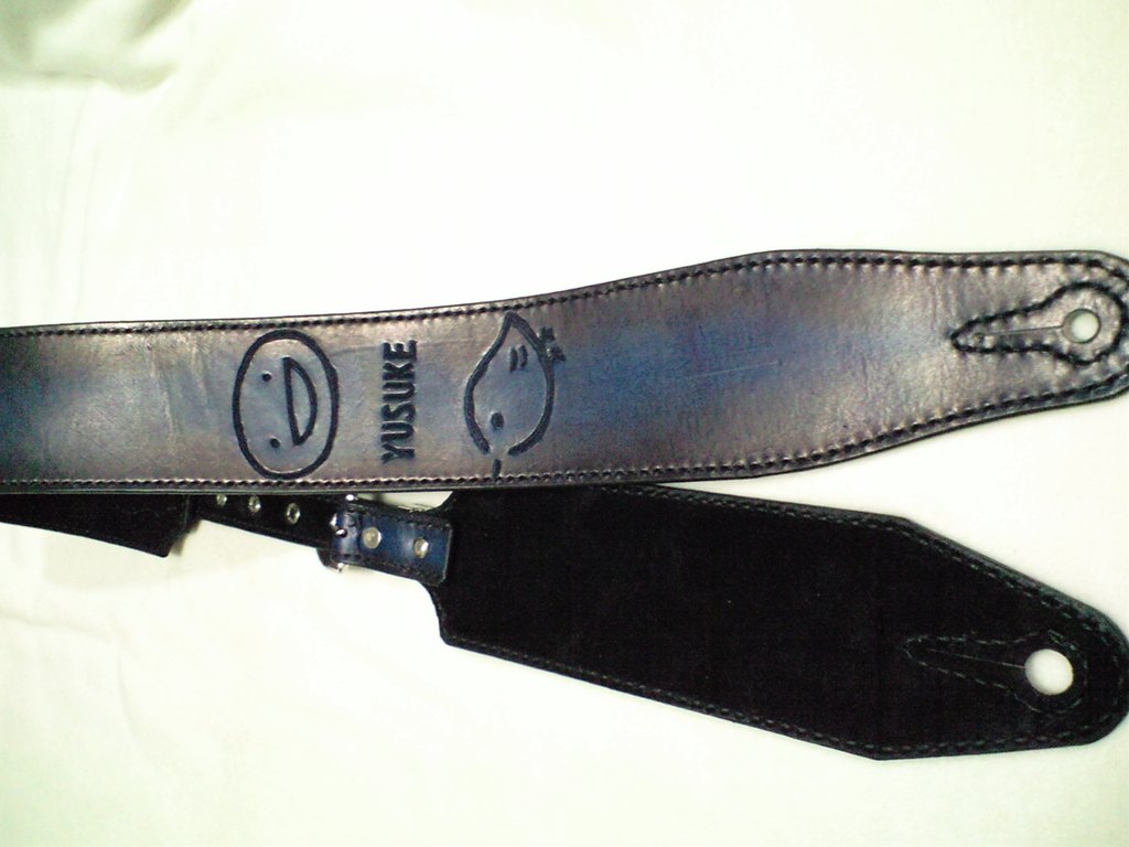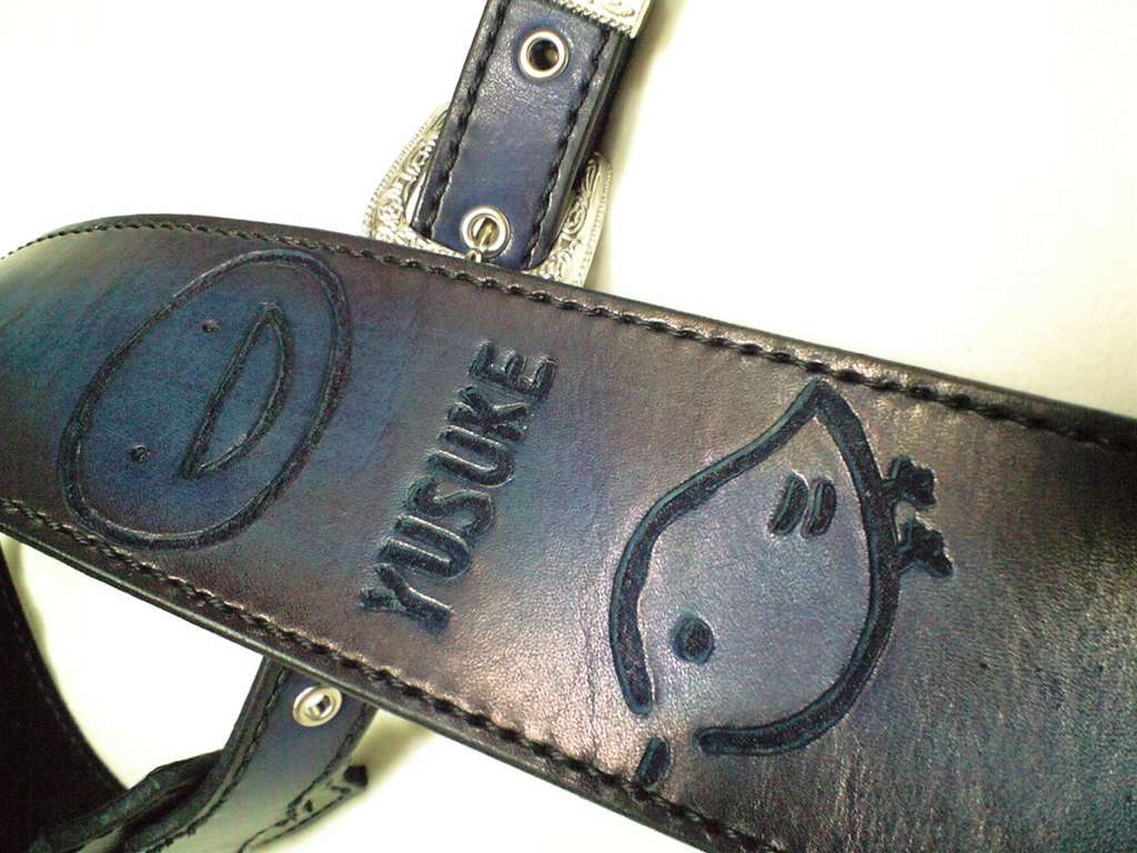7cm幅。濃い青に黒のぼかしを乗せ、フロント部にはトレードマークのイラストをカービング。可愛いイラストを目立たせるため、実線部分を凹ませました。この方法、絵柄が意外と目立つんです。この本体の濃青→黒のグラデーション染めもけっこう人気があります。エンドピン穴はエンドピンジャック仕様です。