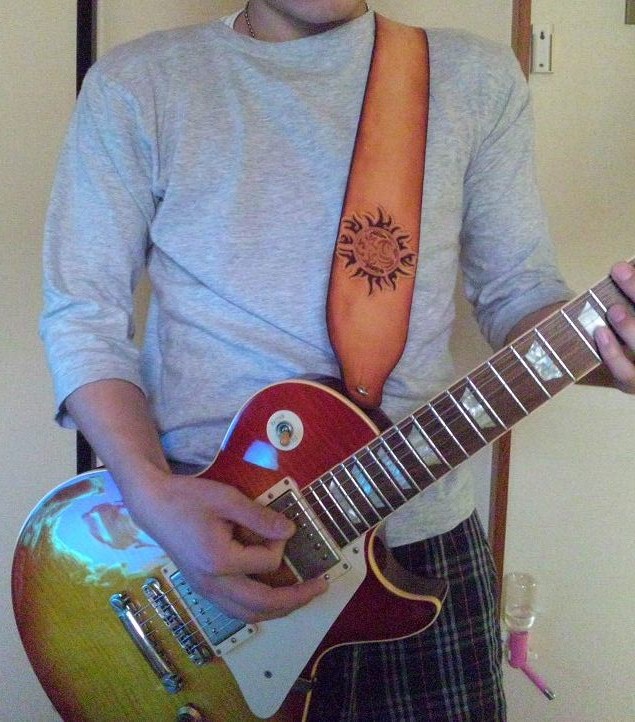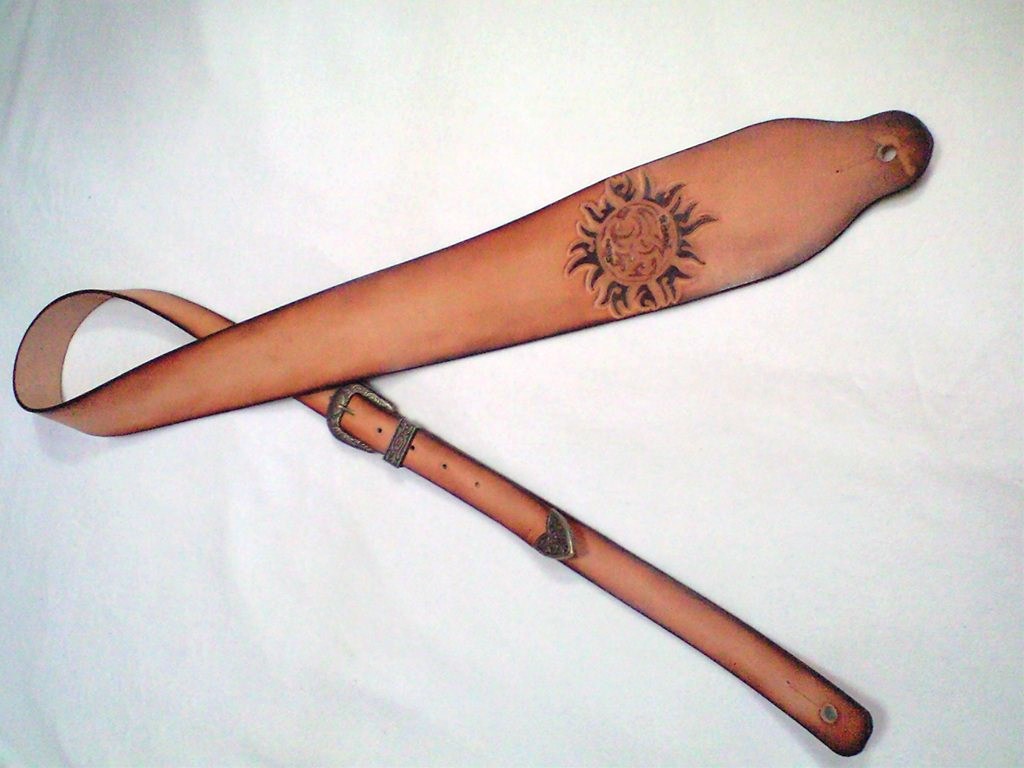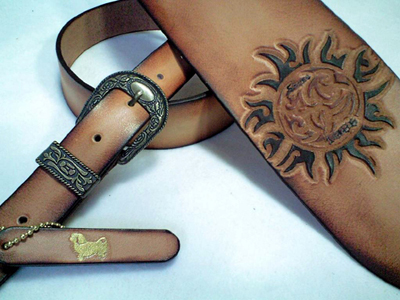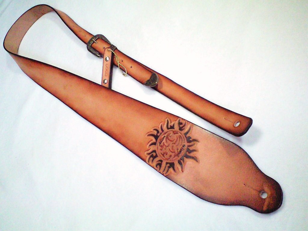腕のタトゥーの模様をそのままストラップ前面に彫り込んだものです。カービングをして立体感を出すためには、ある程度の大きさが必要なので、このようなフォルムになりました。全体のぼかし染めも含めて全て同一色の染料の濃淡で染め分けています。