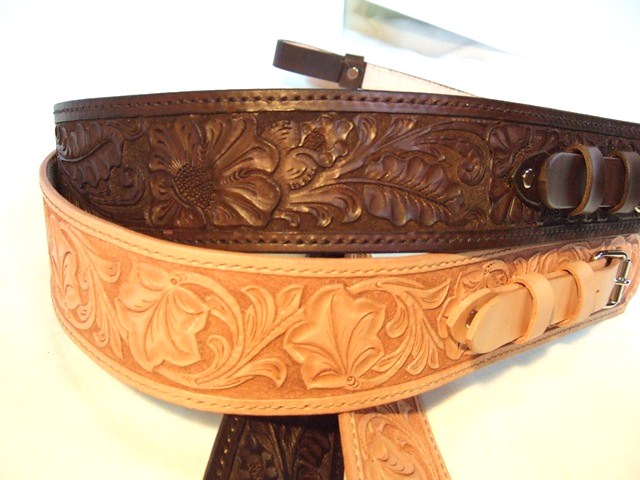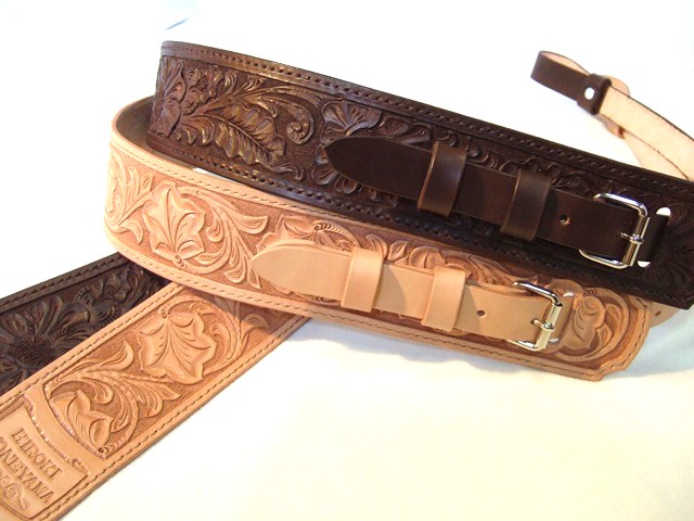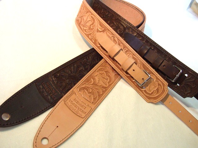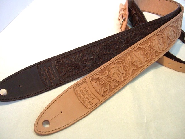 アコースティック用ループストラップで違った模様の前面カービング、ナチュラル色と焦げ茶の2色です。