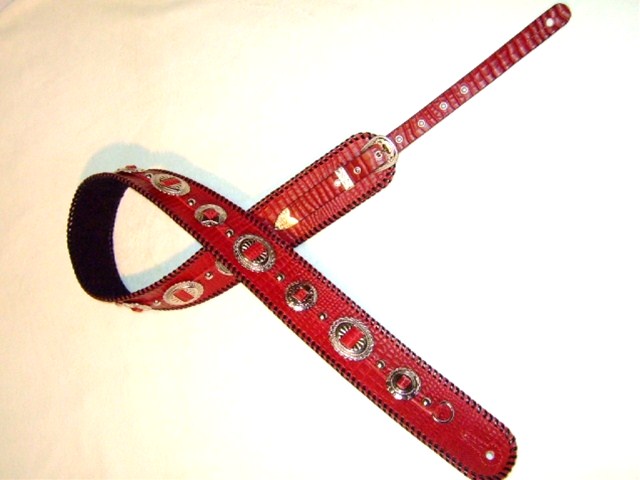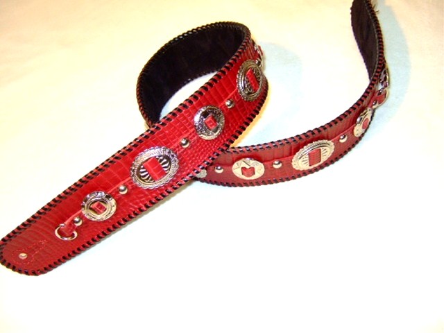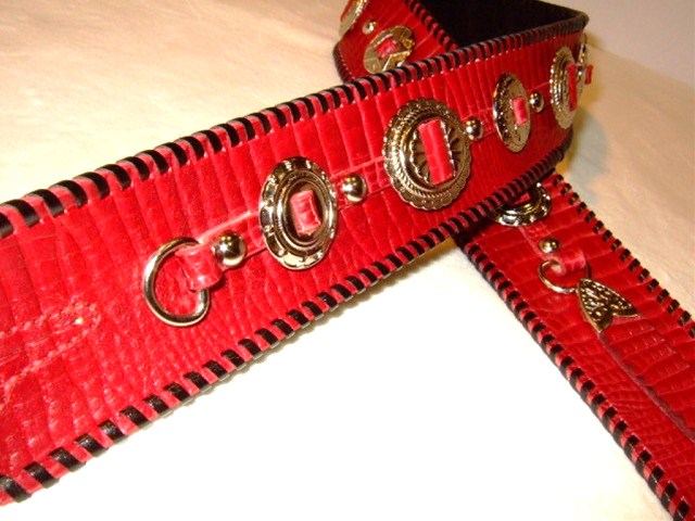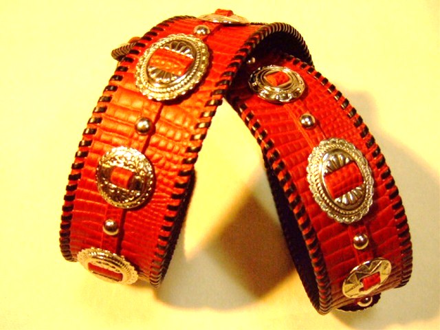 No88と同様の革と色味でNo65のフォルムのものを、というご希望です。幅はこちらの方が1cm広めの6cm幅です。コンチョの両端のスペースにその違いが出ています。仕上がり具合は若干こちらの方が明るめの赤になりました。同じように作ったつもりでも全く同じにはならないところが、1点モノの良さでありましょう。