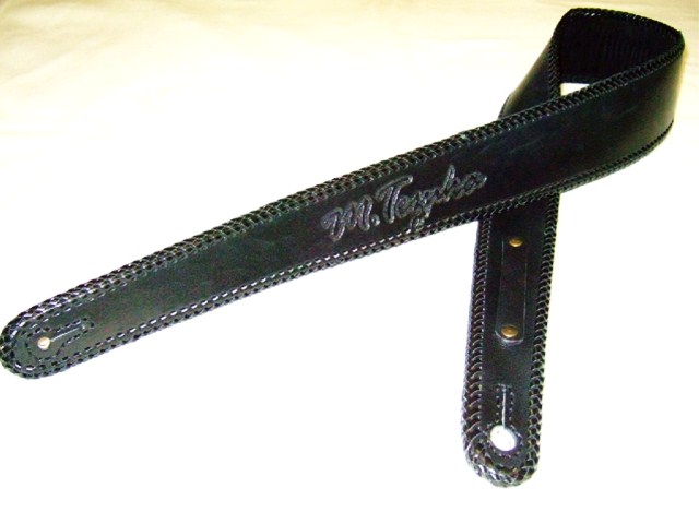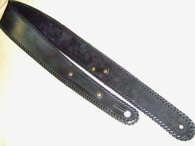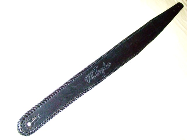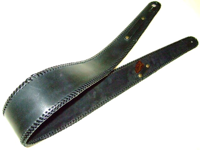 調節機能なしのストレートタイプで、中心部(7cm)から両先端(4cm)に向けて細くなる仕様。肩部にウレタン内蔵で裏革にピッグスエード使用、周囲は黒レースのダブルステッチ。前面にイタリックな文字でネームをカービング、裏側にピックポケット、背面にはシールドホルダー、エンドピン穴はエンドピンジャック用。