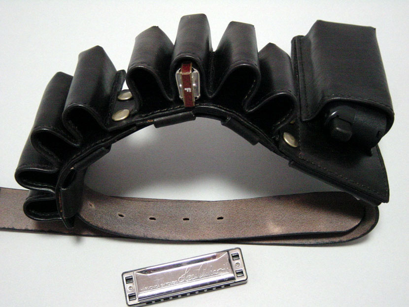 黒のハープホルダー第2弾です。10ホール用の4連×2とクロマチック用で、全部を繋げられるように、とのご注文でしたので、それぞれ単独使用可ですが、ジャンパードットでジョイント可能にもなっています。前回のホルダーからハーモニカの出し入れ口の仕様を変更しました。ハーピストのみなさんはステージでのアクションが思いの他激しいようで、『身体が動いてもハーモニカがホルダーに維持出来るキツさ』を求められる場合がほとんどで、神経を使います。今回はハーモニカをずっとお預かりして、完成後に確認をとることが出来たので助かりました。