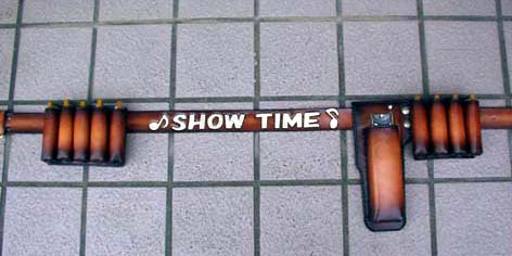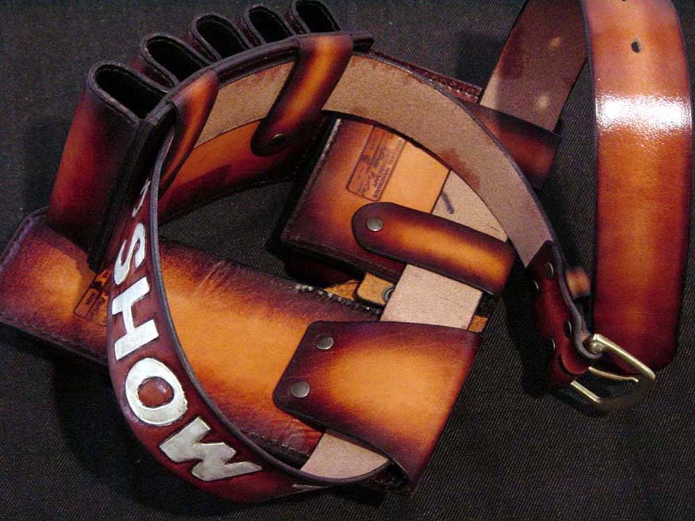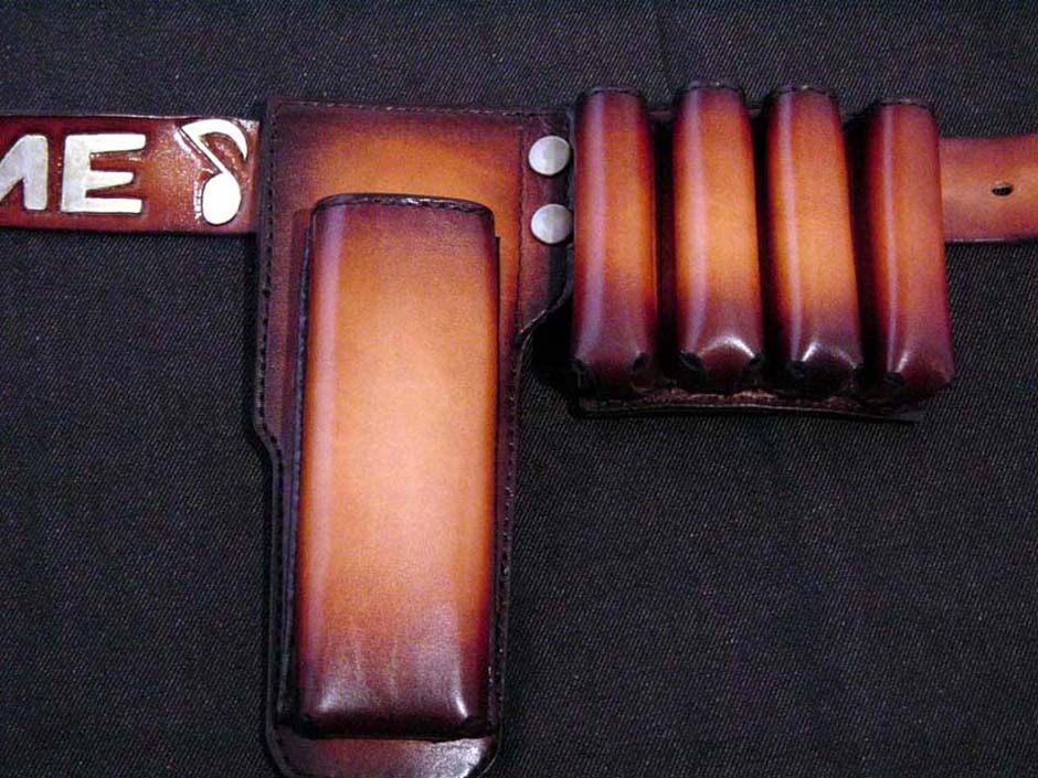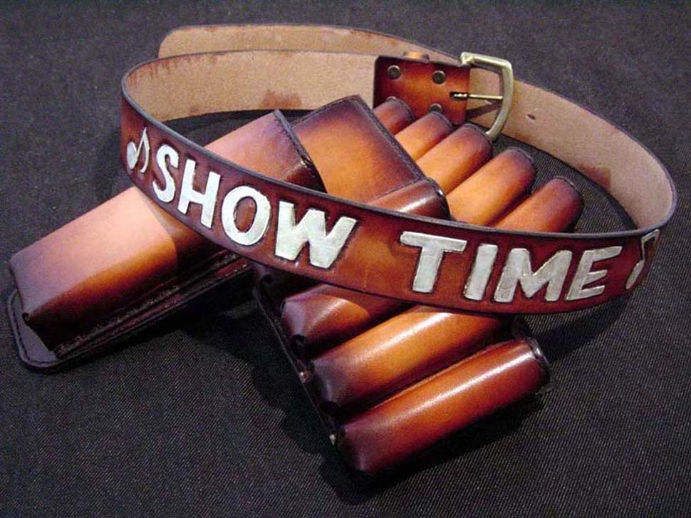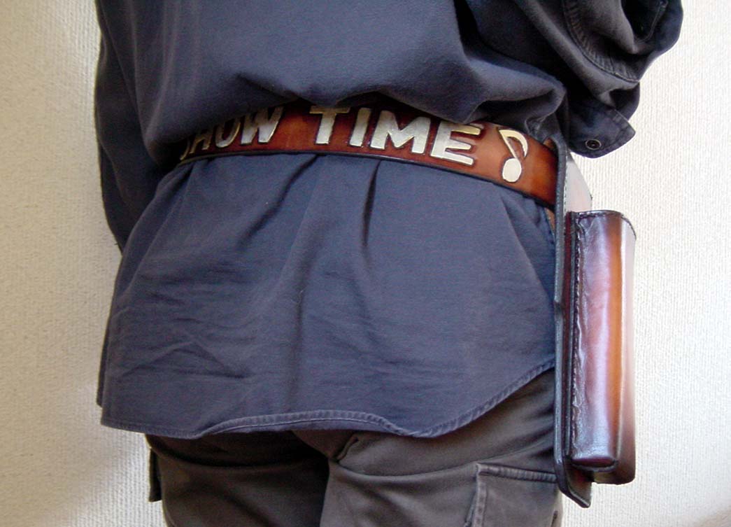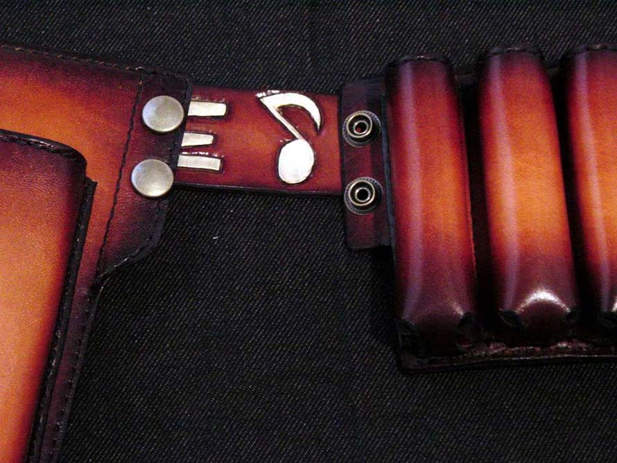 TIME♪の文字を別の革で貼り付ける、というご要望でしたが、ホルダーをスライドさせるたびにひっかかる可能性があるので、カービングしてペイント仕上げに変更しました。文字の色は角度によって白に見えたりゴールドに見えたりと、ステージ映えするパールゴールドです。