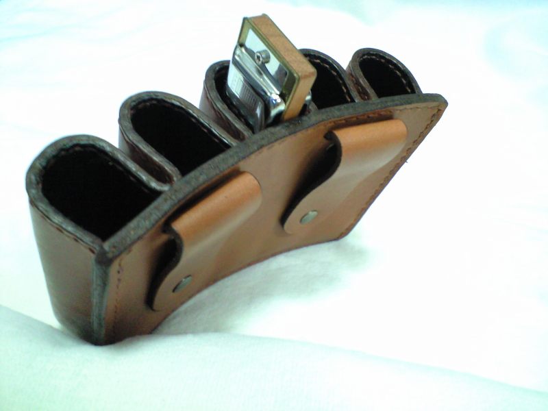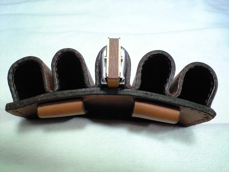 通常ホルダーにはラティーゴという革を染めたものを使うのですが、これはご希望によりソフトオイルレザーのタンという既製の色をそのまま使いました。しっとりしたソフトな革ですので柔らかく馴染みがいいです。アメ豚の総裏付ですので、形状はしっかり維持出来ています。