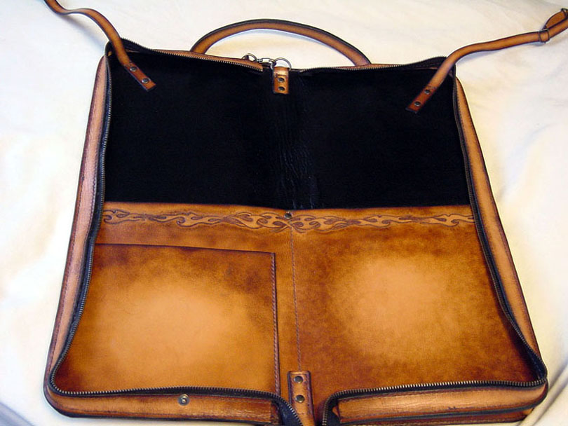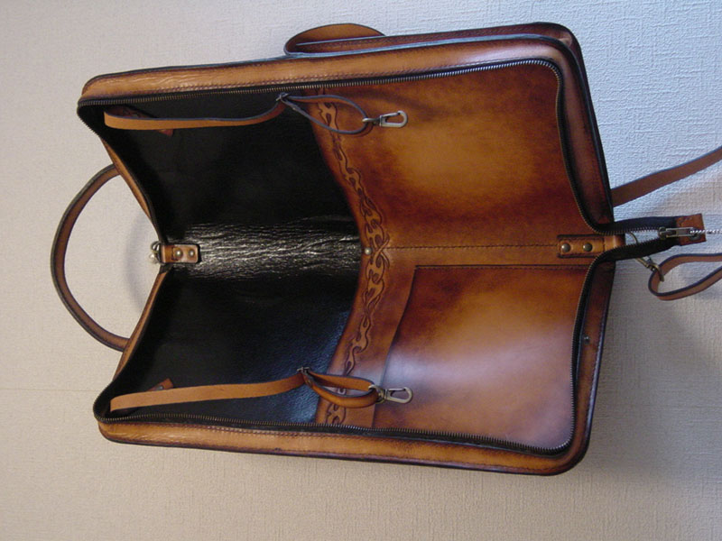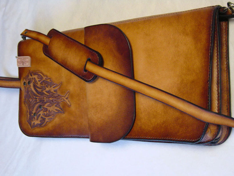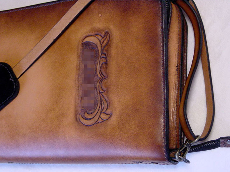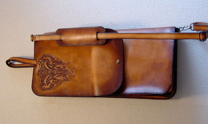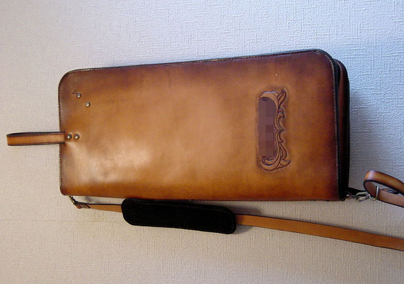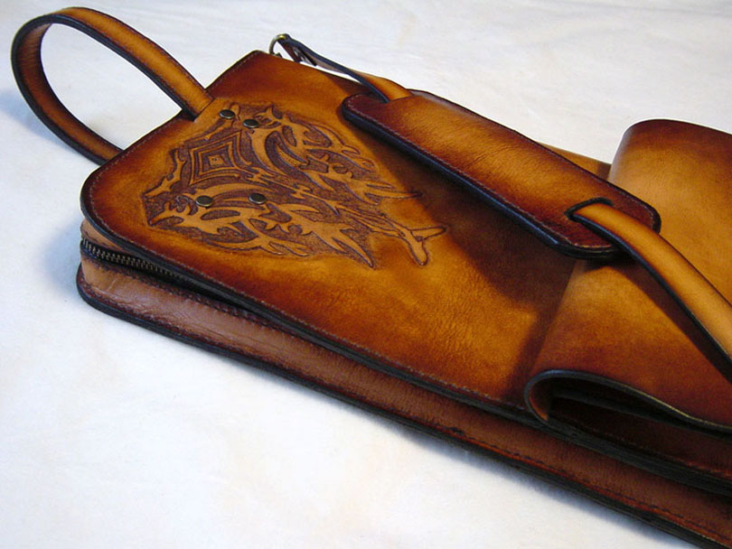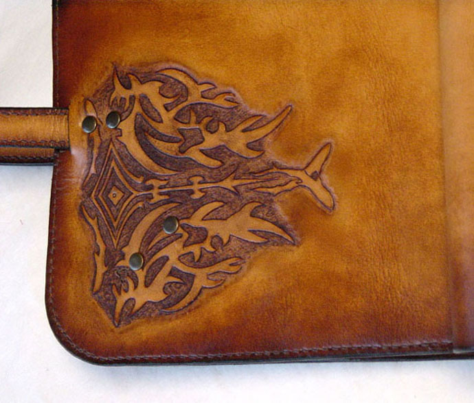 ギャラリーのNo2のケースの画像と、ご自分がお持ちの市販のケースとを参考に、形状をスケッチしたものを郵送していただきました。しかしそっくりではなく自分らしい模様を入れたいとのことで、唐草模様等ではなくトライバル柄を使うことにいたしました。No2のものとはまた雰囲気が違う仕上がりになりました。本体部はかなりの厚さなのでカシメ留めに加えて縫製で補強もしてあります。もちろん全て手縫いです。