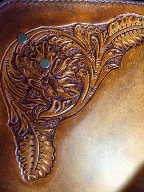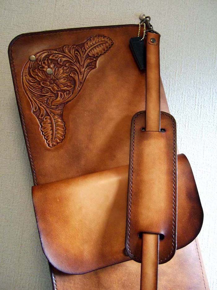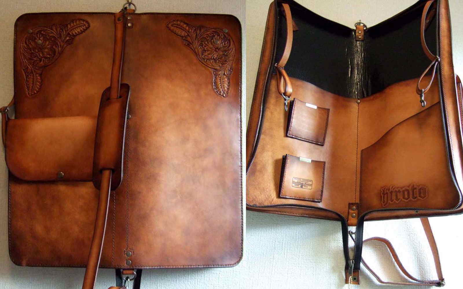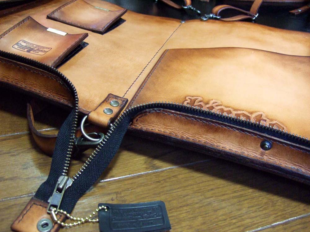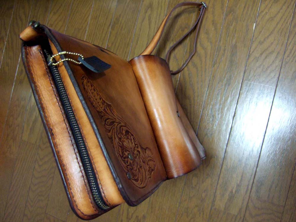 No.2をご要望に応じてアレンジしたバージョンです。内側のポケットは、お使いになっているケースの使いやすい形をそのまま取り入れました。持ち手は必要ないとのことで外観はかなりシンプルになりましたので、両サイドのカービングを気持ち派手めなものにいたしました。ご希望により内側ポケットにFatCatの焼印を入れさせていただきました。一生モノを、とのことでご注文をお受けしましたが、使い込むうちに経年効果でどんどん味わいが出てくるので、お使いになりながら革製品のよさを実感していただければと思います。