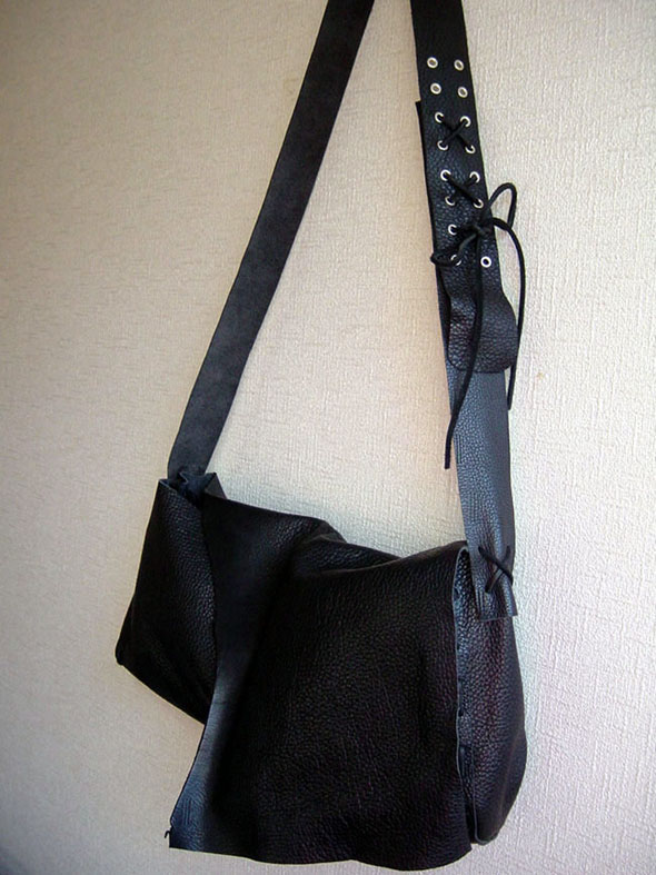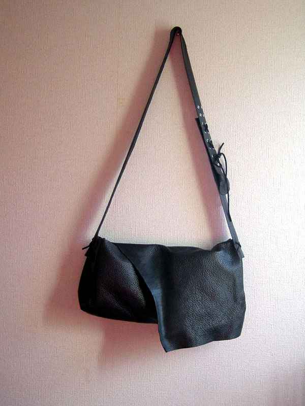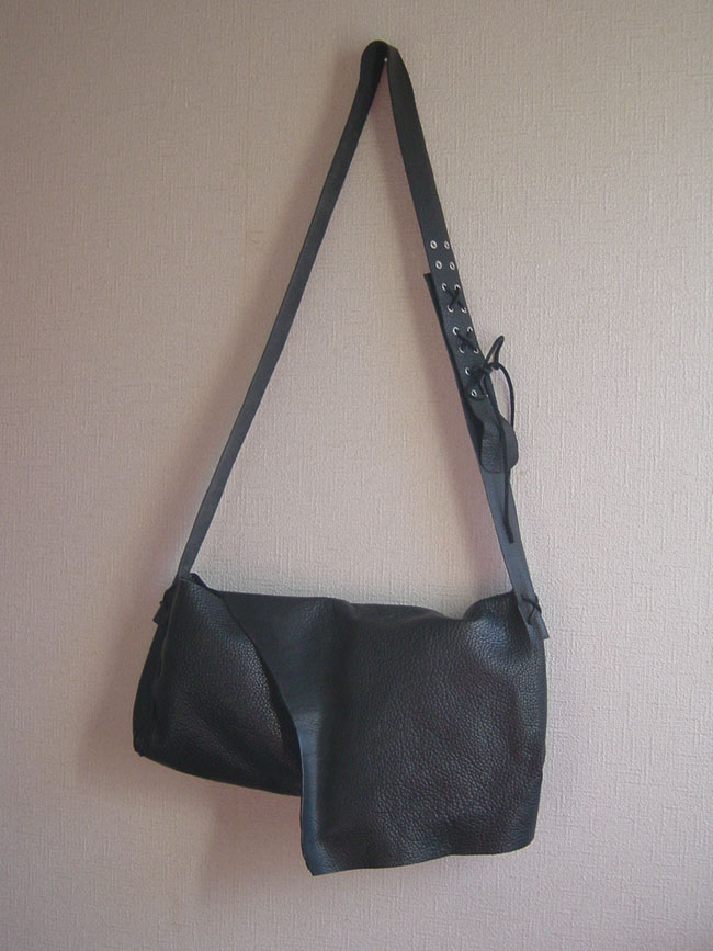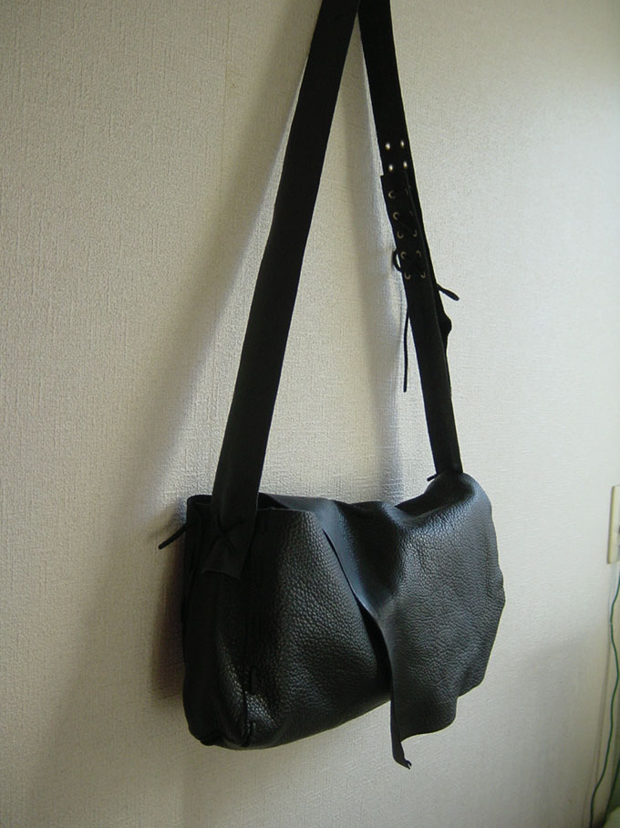 バッグ本体は、切革の形をそのまま利用して作りました。くったりした革の質感を生かすために縫製をせず、革紐で組み立てました。ショルダーベルトの長さ調節も革紐で、ポイントにニッケル色のハトメを使用しました。柔らかすぎて形が崩れやすいので、フタの内側の出し入れ口にマグネットを使っています。