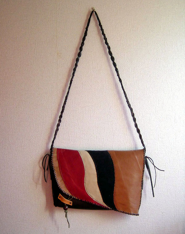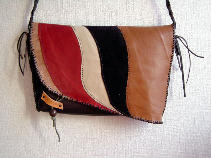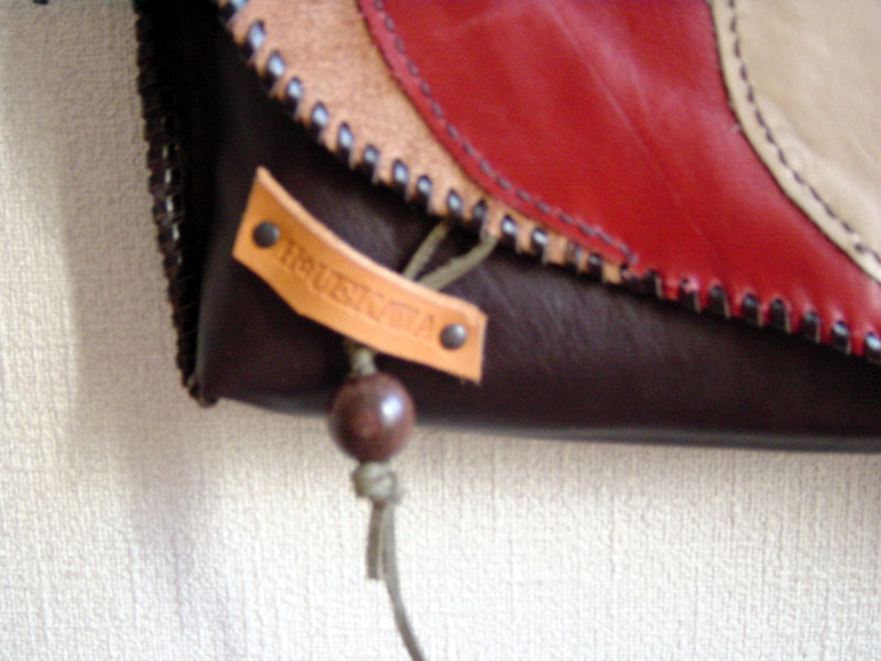 フタ部分の各色は端革の形をそのまま使うことで、わざと不規則な切り替えのカーブラインを出しました。全体に裏革を貼ってあるので、見た目よりしっかりした作りになっています。フタに留め金具は使いたくなかったので、自然な素材を使って見た目にもワンポイントになるようにしました。