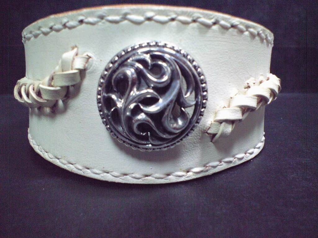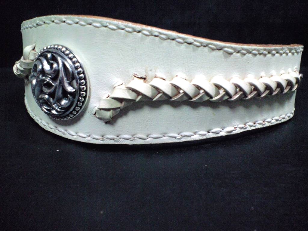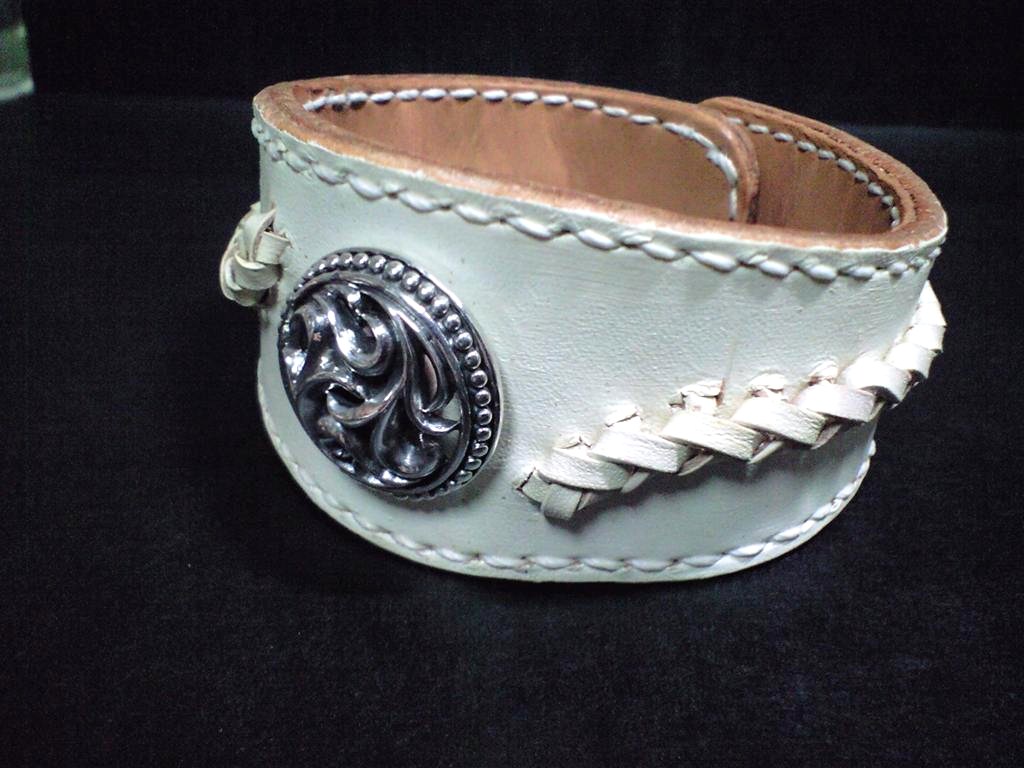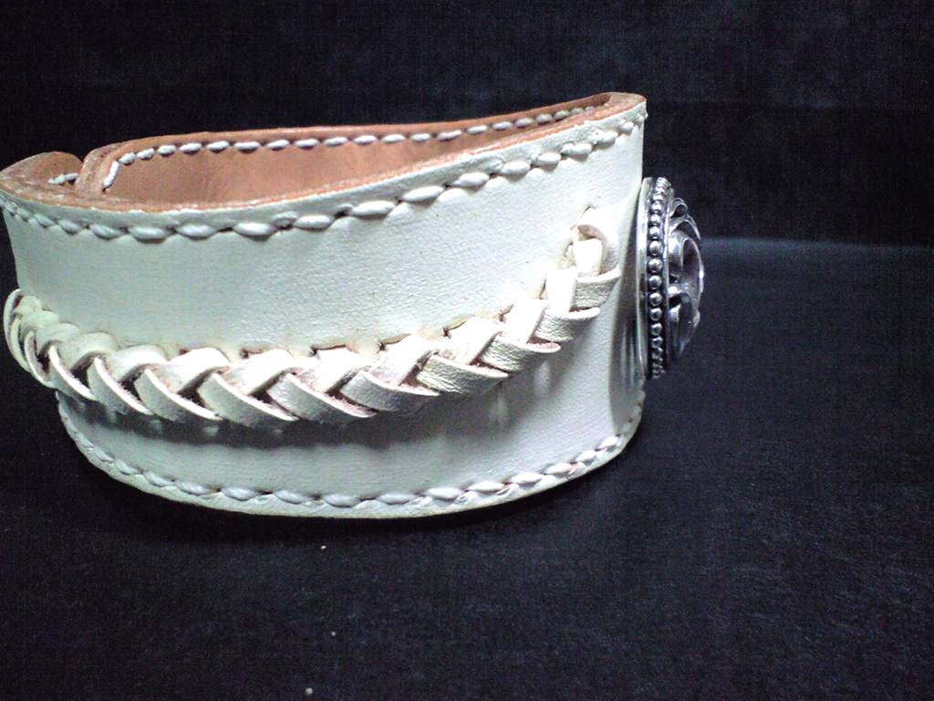 渋めのトライバル模様のコンチョをメインに据えたバングル。色はややクリームがかったアンティークな白で、コバはナチュラルな革の色が出て欲しい、とのことで、ヌメ革の表面だけにリキテックスを塗りました。コンチョだけでは寂しいので編込みを付けてみました。革レースでの着脱もネイティブ感があってよかったのですが、ここは手間のかからないホックを選択。