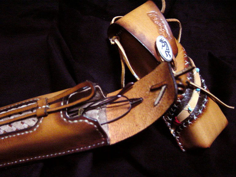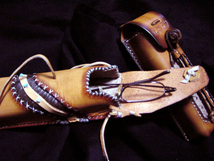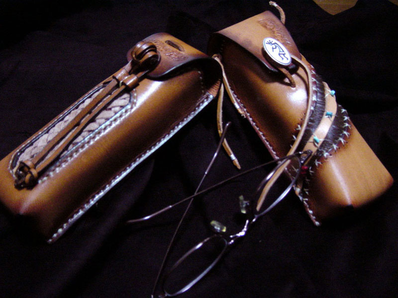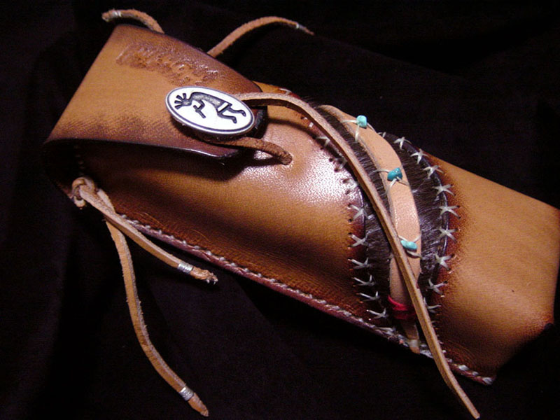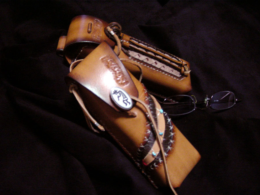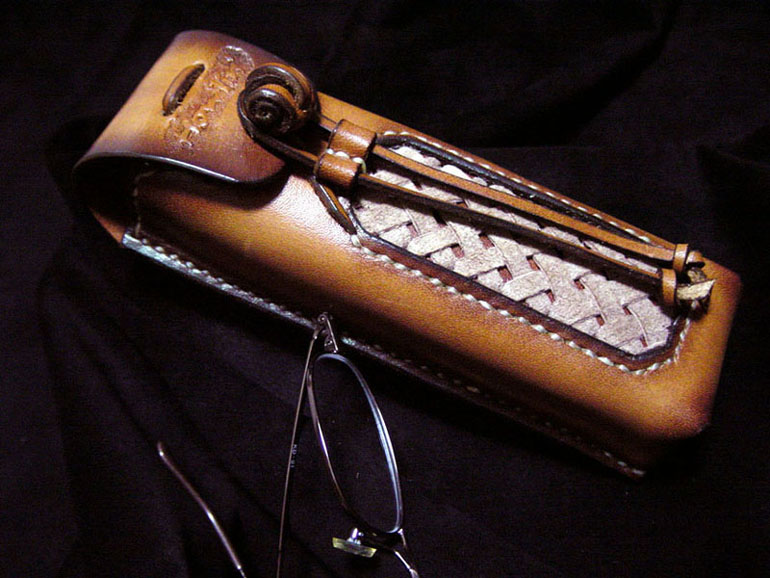 カラビナで腰に提げる仕様で、ワイルド系しかしNotバイカー系、開閉はホックでないもの、というご注文でした。ですので大好きワイルド&素朴系で金具を使わずインディアンの手仕事のごとき雰囲気に仕上げてみました。内側はメガネ保護のためピッグスエードを貼っています。