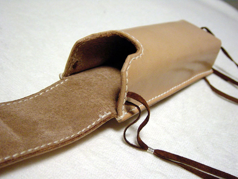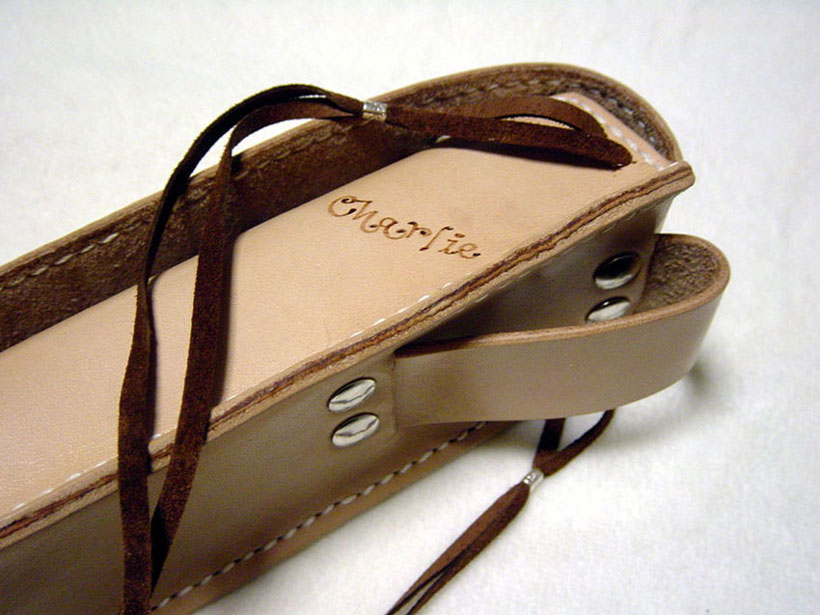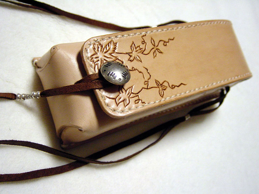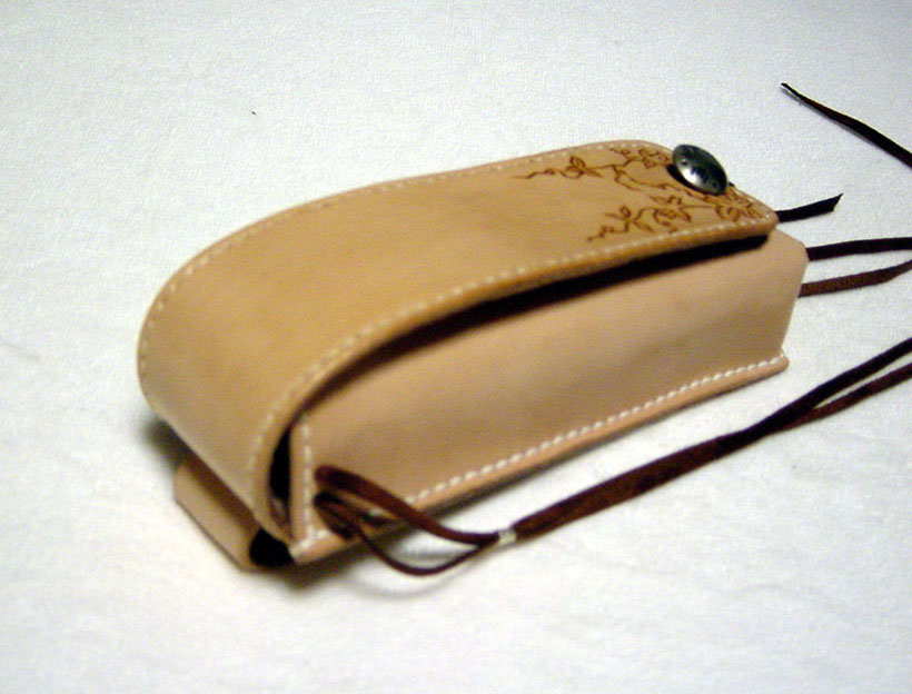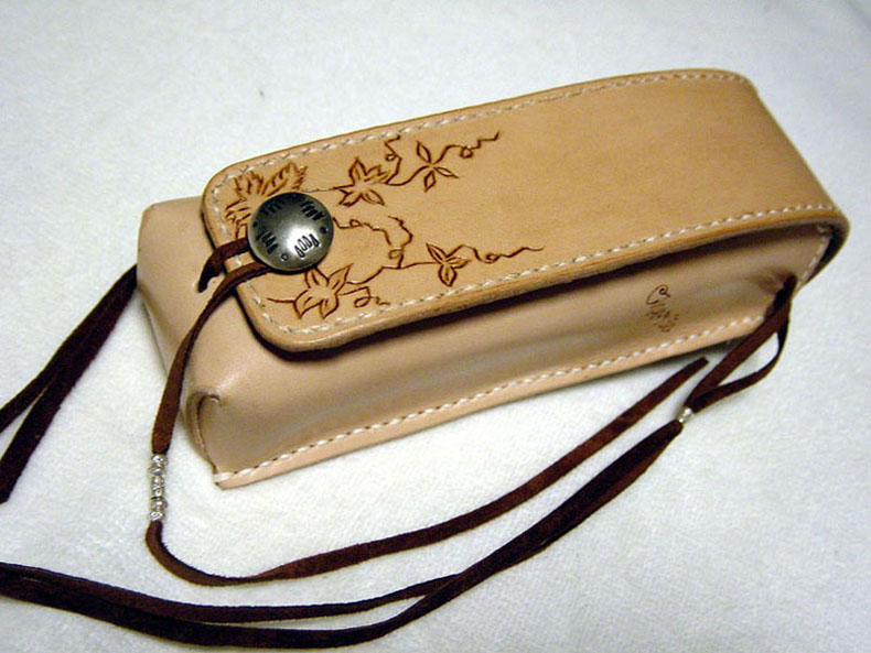 メディスンバッグの画像をいただいて、「こんな感じで眼鏡ケースを・・」というご注文です。その他、ご希望のサイズ、ネームのフォント、コンチョの種類を指定していただいて制作いたしました。素朴なネイティブ路線で革の良さが出せたと思います。ネームはカービングには向かないフォントでしたので、電気ペンで描きました。