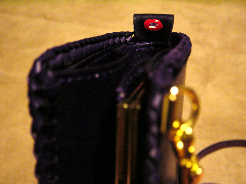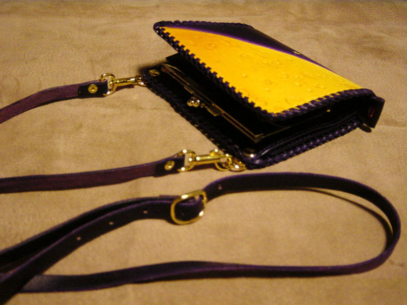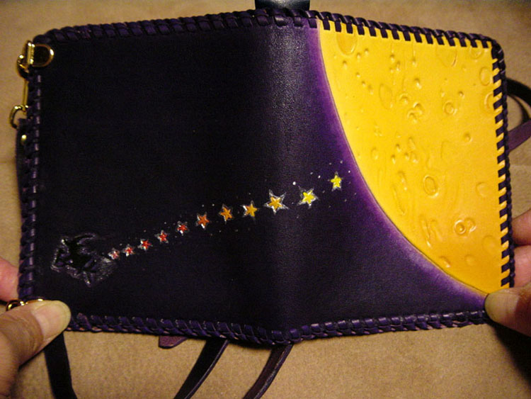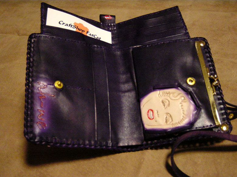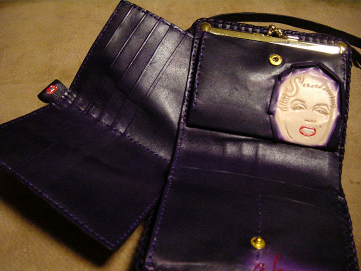現在使用中の使い勝手のよい財布と同じ形で裏パーツの向きを変え、札入れ部には10枚入るカードホルダーを入れたいとのご希望でした。そして、ご自分の好きな色やイメージを伝えていただき、その中から濃い黄、深い紫、月、モンロー、唇等をピックアップして制作しました。そして、ショルダーストラップが付いていたら便利だな〜、というご要望にもしっかりお応えしました。なるほど便利そうですね!