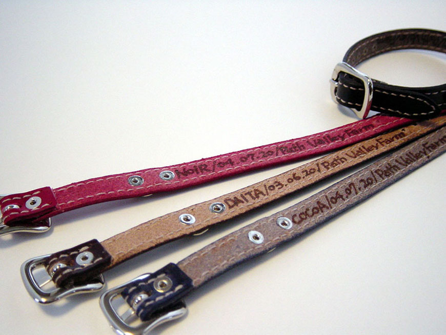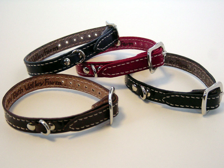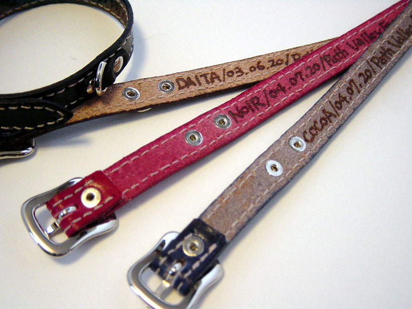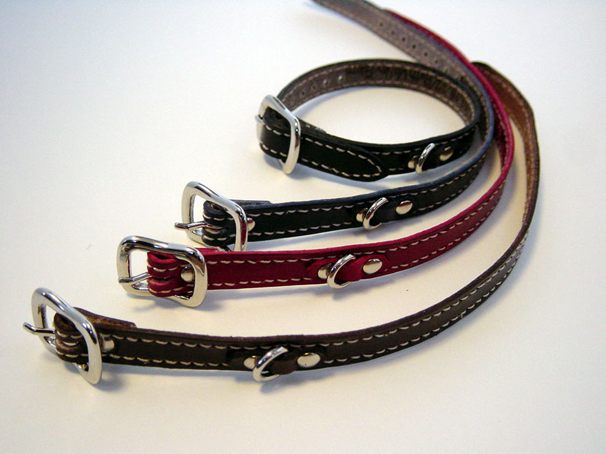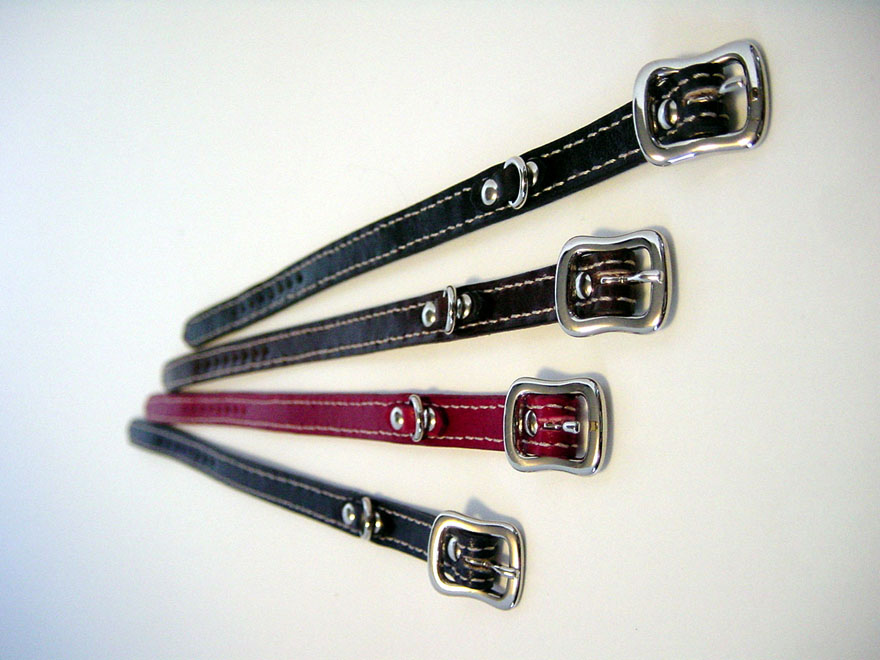これはフェレット用の首輪です。犬や猫より華奢なようで、幅が1cm、ベルト調節幅が14〜18cmという小さなものです。ネームプレートと鈴を付けたい、とのことでDカンををひとつ付けました。裏には名前と生年月日(?)とお店の名前(?)が焼き付けてあります。ステッチと金具だけのシンプルなものですが、フェレット用の市販の首輪はなかなかないそうで、喜んでいただけたようです。