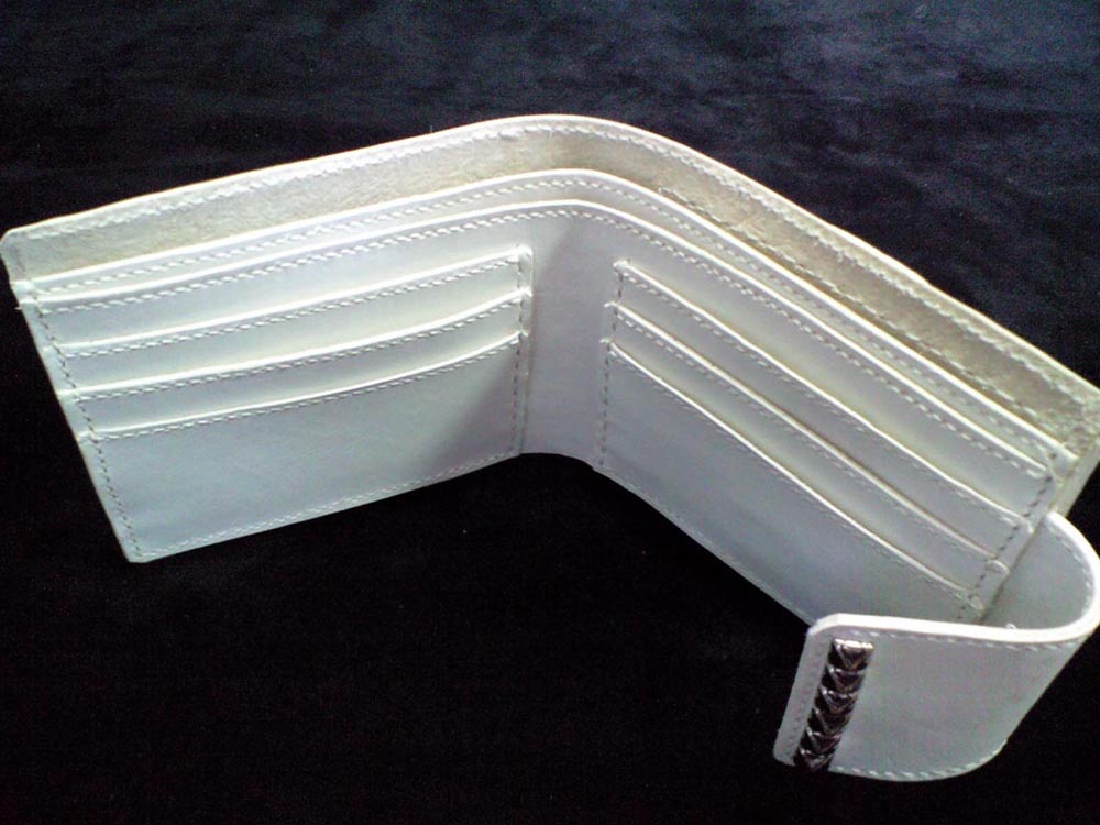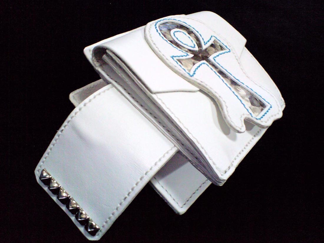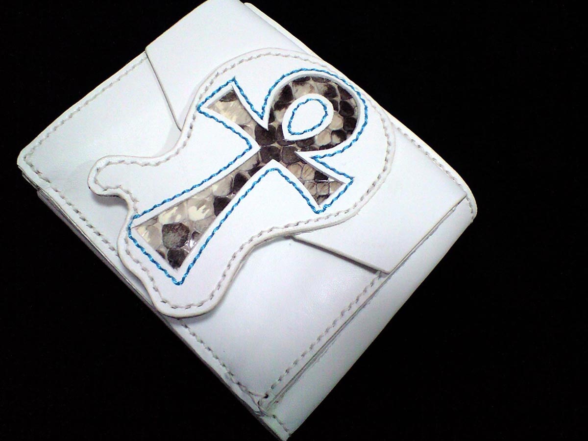 外側に小銭入れを、とのことで、ご希望のANKHのワンポイントをギターの形に大きくかたどった大胆なデザインにしてみました。札入れとカードが数枚入れば・・・ということで、内側は極力シンプルに。