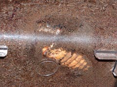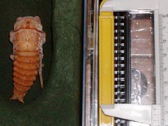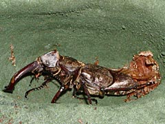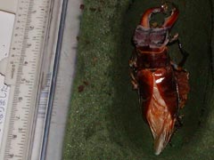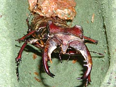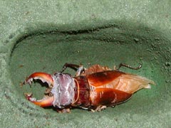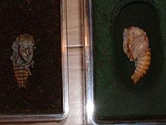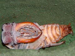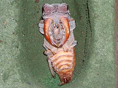 (上)右後脚の方向がおかしい。羽化後、無事に育つかどうか心配です。 (下)大アゴの形状が透けて見えます。蛹の大アゴは普通型だったのに、中身はエゾ型! (撮影/6月25日 )