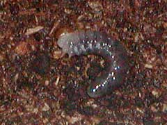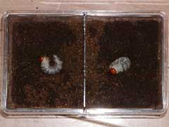 | まず、手近の固まりをそっと砕いてみます。いきなり2頭いました。よく見るとバットのあちこちで幼虫が動いています。注意深くマットを探り、1頭、また1頭。。。外からは見えなかったのに、次から次へと。。結局このケースには64頭がいました。 10ミリ以下の半透明なものから、15ミリくらいのやや白みがかったものまで。。。2頭の♀の★時期にも開きがあったし、何度か産卵をくり返したようで(64頭を1頭が産んだとはさすがに思えない)、すべて1令幼虫でしたがその大きさにはだいぶ開きがありました。 ![]() |