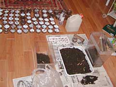準備したもの ●四角い大きなバット(←この中に土をあける。※100円ショップの園芸用品) ●スプーン類数種(幼虫を手で直接触らないため) ●空のプラケース(使用済みマットをこちらに移していく) ●プリンカップ(大小あわせて16個) ●製氷皿(幼虫の一時保管用→KwAのクワガタ飼育GOODS参照) ●加水済みクヌギマット(くぬぎ純太くんとショップの発酵済添加マットの混合) ●水の入ったポリ容器と洗面器(途中で加水済みマットが足りなくなったとき、その場で作る) ●予備容器、新聞紙、ビニール袋など(捨てる土を入れたり、下に敷いたりする)