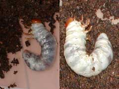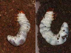 | 年が明けて2003年、1月中旬に8頭、2月上旬に4頭を里子に出すため、ケースを暴きました。 1月の時点では、7)の12/7にケース移動した6頭のうち4頭を暴いたところ、9gに育っていました(この時点での最大サイズ)。2月には残りの2頭が、15gになっていました。この6頭は、いちばん大きいグループで、「ZAKUクルビ用関西バージョン」マットに投入していたものです。(それぞれの写真の右側がそう。) 他の幼虫は、中くらい以下のグループで、1月時点でも小さく、脂肪の蓄えも少ないようでした。 左がハイパーマット、右が9g(ZAKUマット)(1/15) ![]() 2/9に暴いた4頭のうち、小さめの2頭は、6.5gと10gでした。(←この2頭は「ハイパーマット」使用。) その時々の手持ちのマットの関係で、大きめの幼虫を昨年12月にZAKUマットに投入していたので、マットのおかげで大きくなったのか、もともと大きめの個体なので発育がはやいのかは、現時点では判断できません。 左が10g(ハイパーマット)、右が15g(ZAKUマット)(2/9) ![]() |